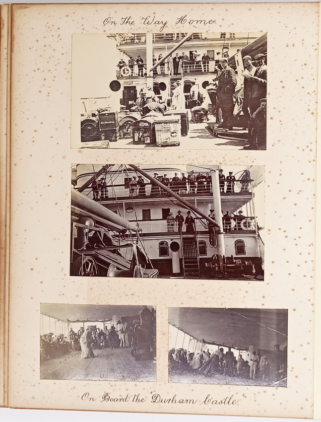 No clues as to the identity of the travellers are offered. Several photographs show three men and three women. The final photographs on board the Durham Castle show men and women playing deck sports. A final photograph shows the group disembarking with cabin trunks and boxes one of which bears the name Miss Mary Harvey painted on the end.
