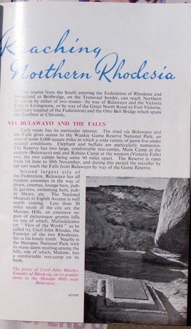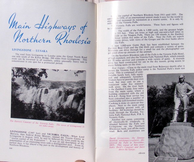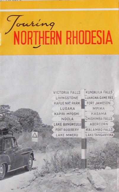 Tourist booklet, colour illustration, fold-out map, reaching Northern Rhodesia, main Highways of Northern Rhodesia, Special Tourist Areas, motorist's driving log, notes, 36 pages, 125 x 205mm, condition: very good.