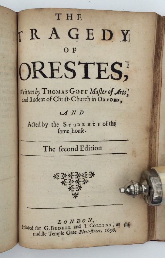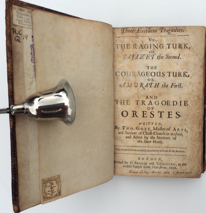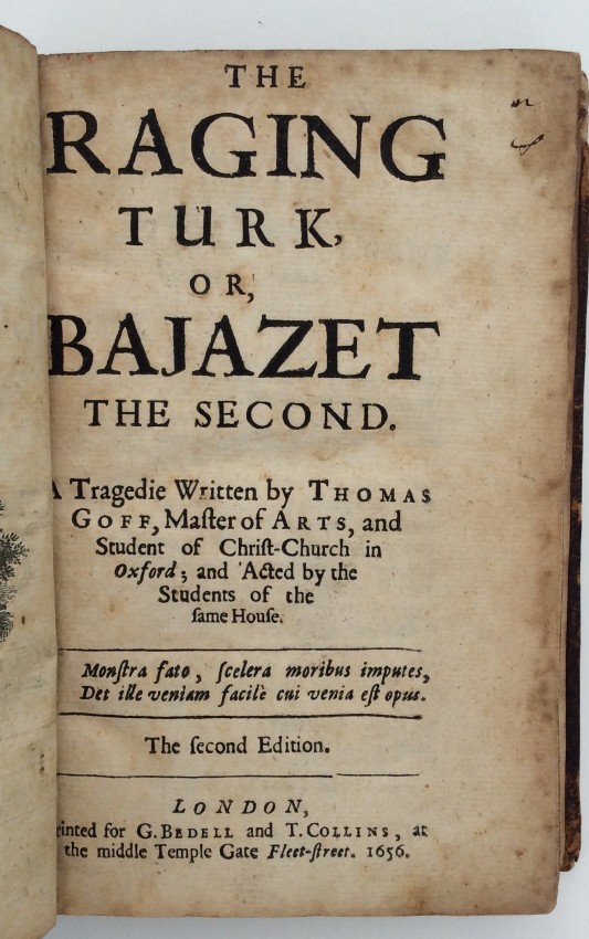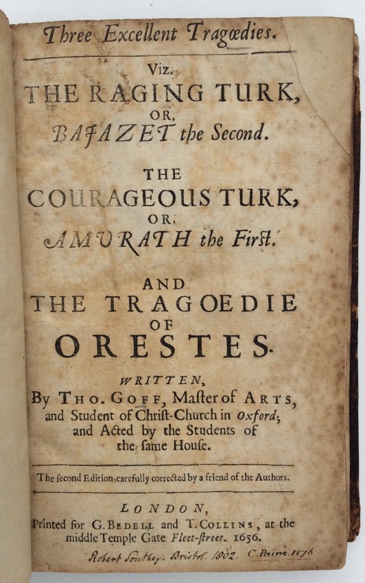 Three Excellent Tragoedies. Viz., The Raging Turk; or, Bajazet the Second. The Courageous Turk; or, Amurath the First. And the Tragoedie of Orestes. Written by Tho. Goff [sic.], Master of Arts, and Student of Christ-Church in Oxford; and Acted by the Students of the same House. . . carefully corrected by a friend of the Authors.