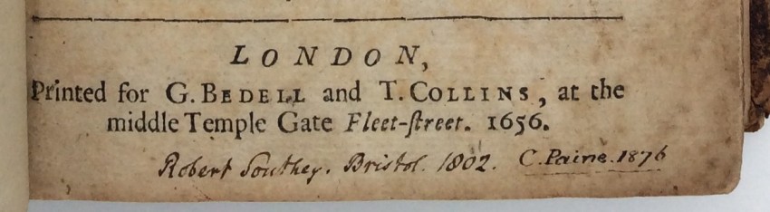 Provenance: Thomas and Anne Purcell (early inscriptions on final page); Robert Southey (inscription at foot of title 'Robert Southey. Bristol. 1802', shaped armorial bookplate on verso off title); Cornelius Paine (inscription dated 1876 at foot of title, signature on front free endpaper); Pickering & Chatto (small label to foot of front free endpaper); Frederic Morrell (ink stamp on front pastedown).