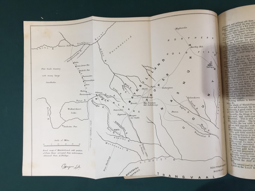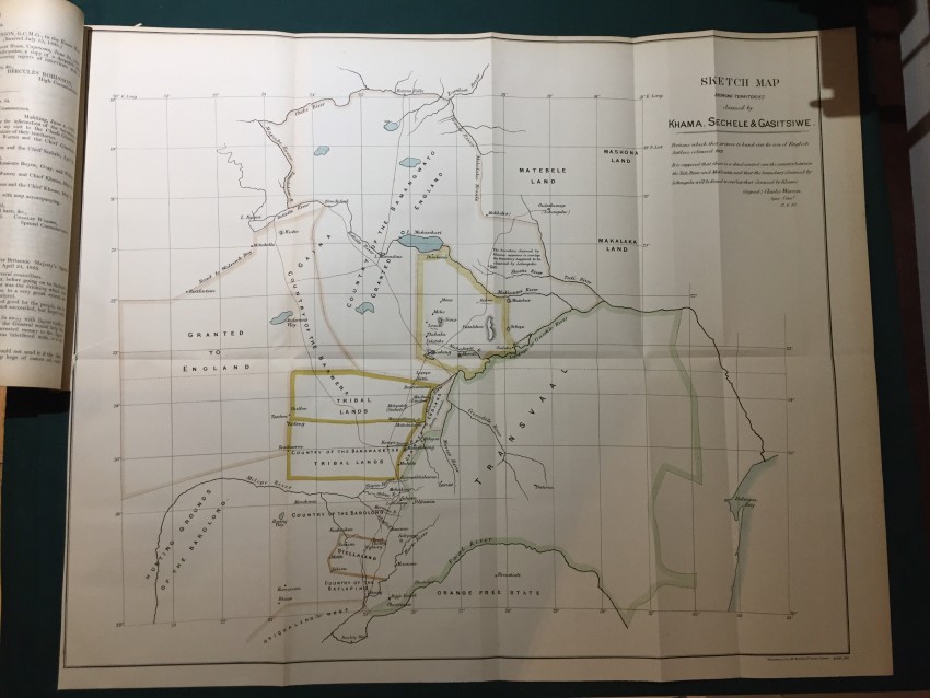 Correspondence respecting the War between the Transvaal Republic and Neighbouring Native Tribes, and generally with reference to Native Affairs in South Africa. Presented to both Houses of Parliament by Command of Her Majesty. April 1877 [Bound with] Further Correspondence respecting the War between the Transvaal Republic and Neighbouring Native Tribes and generally with reference to Native Affairs in South Africa. (In continuation of [C.-1748.] April 1877.) Presented to both Houses of Parliament by Command of Her Majesty. April 1877. [Bound with] Transvaal. Further Correspondence respecting the Affairs of South Africa. (In continuation of [C.-1776.] June 1887.) Presented to both Houses of Parliament by Command of Her Majesty. July 1877. pp.xv+255; x+166; 15. Folding coloured map (overall 32 x 38.3cm.) “Map shewing the relative positions of Griqualand West and the Adjoining Territories.”, Folding coloured map with inset map of South Africa. (Overall 32 x 71cm.) “Map of a portion of the Transvaal Republic showing the scene of the late operations against Secocoeni chiefly from Merensky’s Map. 1875.” [52247]