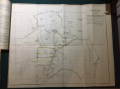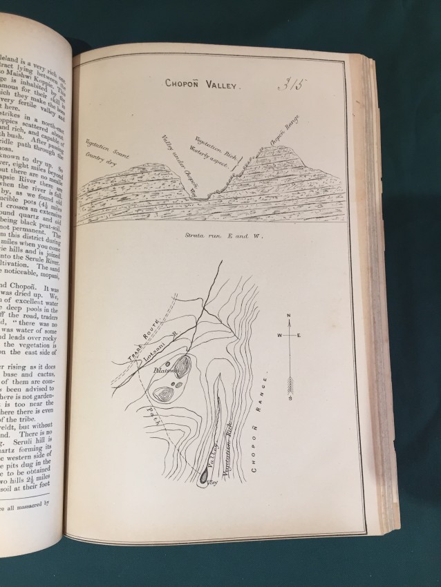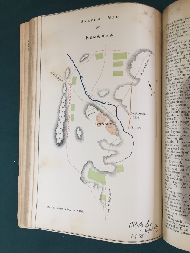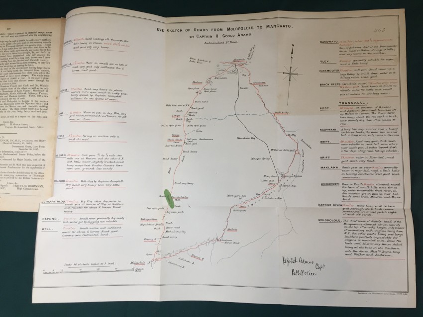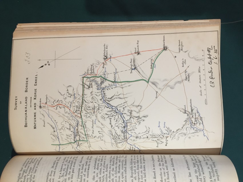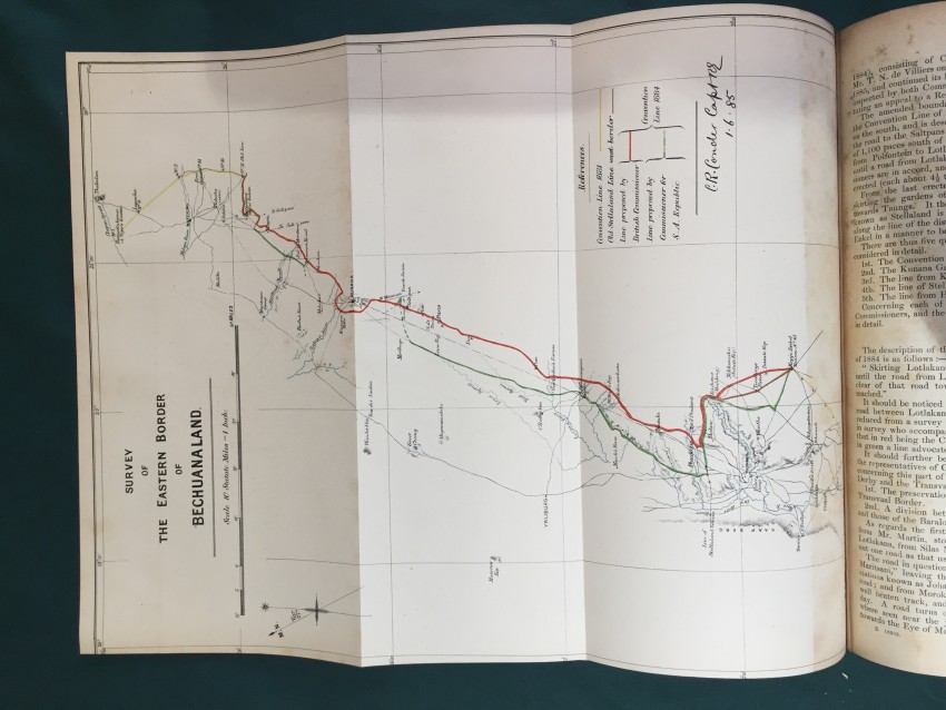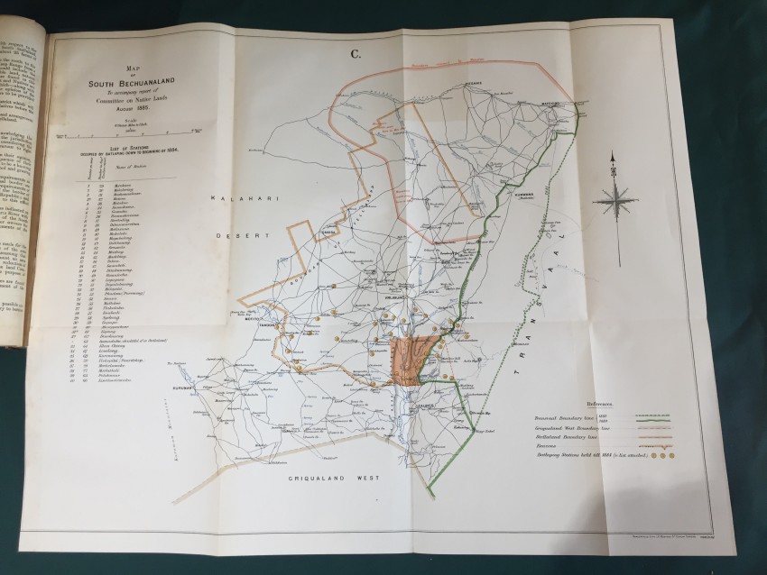 Further Correspondence respecting the Affairs of the Transvaal and Adjacent Territories. (In continuation of [C.-4588] of August 1885.) Presented to both Houses of Parliament by Command of Her Majesty. February 1886. pp.viii+251. Folding coloured map of “South Bechuanaland to accompany Report of Committee on Native Lands August 1885.” (overall 50 x 62cm.) Map of section of “Chopoñ Valley.” (overall 32 x 20cm.) Folding map of “Matibililand with position of Nata River corrected from information obtained from A. Phillips.” (overall 32 x 43cm.) Map of “Survey of the eastern border of Bechuanaland.” (overall 32 42cm.) Coloured sketch map of Lotlakana Gardens. (32 x 21cm.) Coloured sketch map of Kunwana. (32 x 21cm.) Coloured map of “Survey of Bechuanaland border between Matukwe and Kopje Enkel.” (32 x 21cm.) Diagram of the flag of the Stellaland Republic. (32 x 21cm.) Folding coloured map of roads from Molopolole to Mangwato by Captain H. Goold Adams. (44 x 55cm.) [52197]