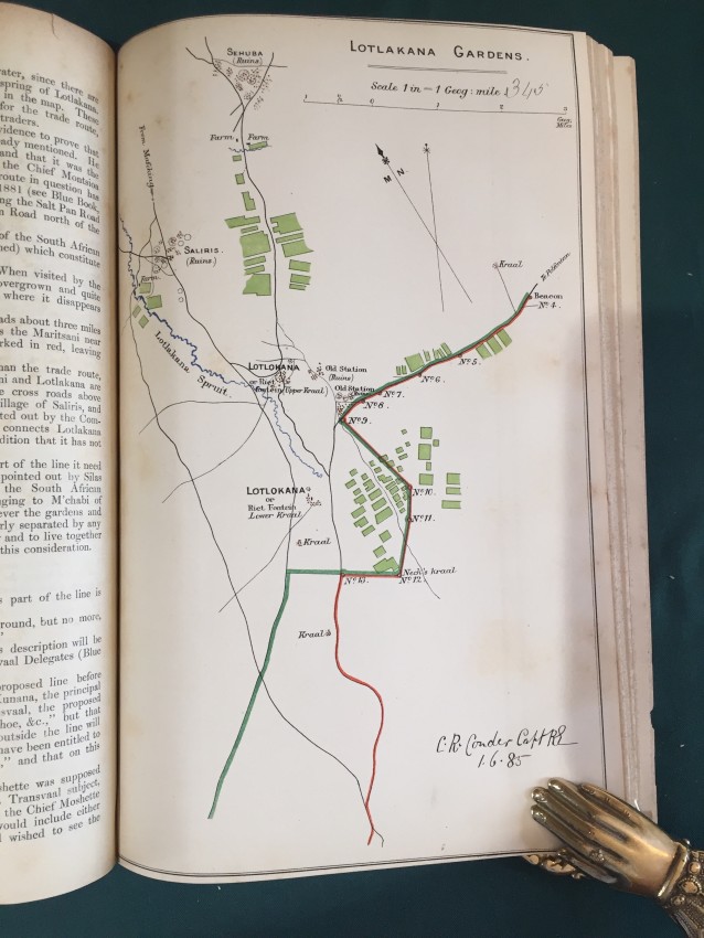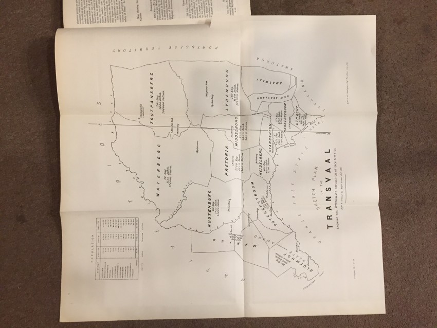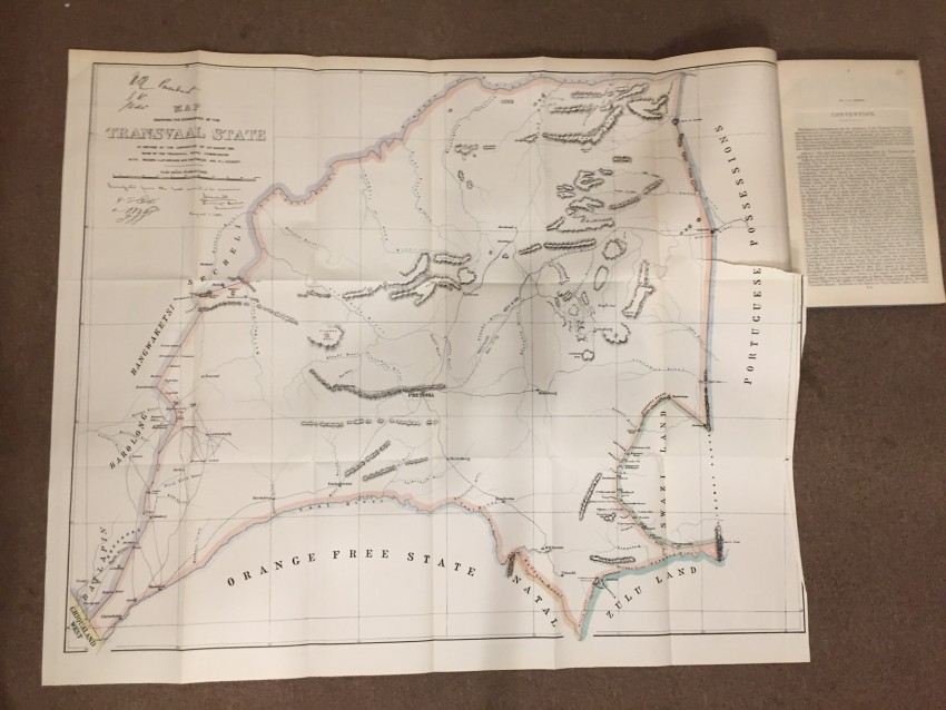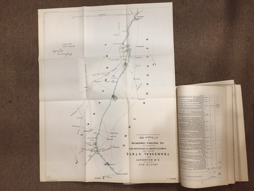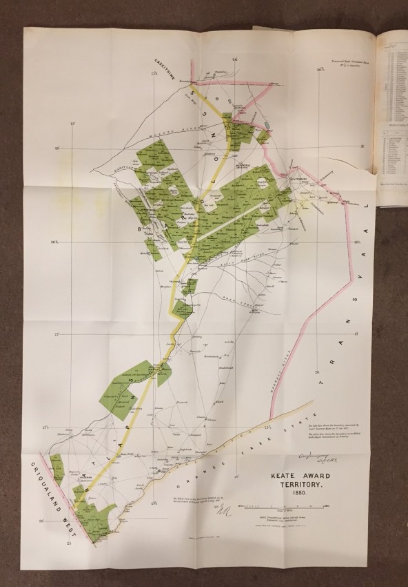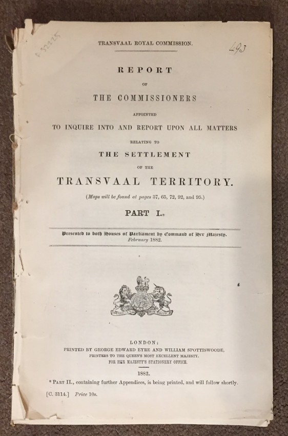 Transvaal Royal Comission. Report of the Commissioners Appointed to inquire into and Report upon all Matters relating to The Settlement of the Transvaal Territory. PART I. Presented to both Houses of Parliament by Command of Her Majesty. February 1882. pp.224. Folding coloured map (overall 75 x 89cm.) “Map showing Boundaries of New Transvaal State”. Folding map (overall 53.5 x 50.5) “Sketch plan of the Transvaal showing the Approximate Population of Each District. From a traaing by Major Fraser R.E. 1881.” Folding coloured maps (overall 62 x 49cm, 56 x 42.6cm.) “Sketch map to illustrate the S.W. Boundary of the Transvaal State beaconed from Ramathlabama to Griqualaland West in accordance with The Pretoria Convention. Of 3rd. August 1881.” Sheet 1 & 2. Folding coloured maps “Keate Award Territory” No. 1, 2, 3 & 4. (overall 91 x 60cm.) (overall 32.3 x 44.2cm.) (overall 32.5 x 44cm.) (overall 32.5 x 44cm.) Folding coloured map (overall 101 x 66.2cm.) “Keate Award Territory 1880.” [52225]