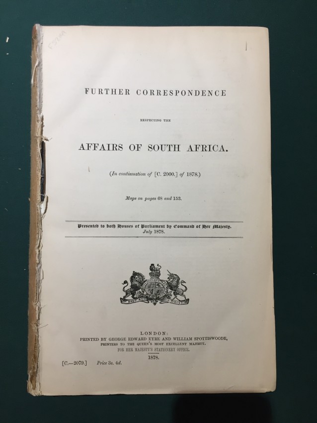 Further correspondence respecting the affairs of South Africa. (In continuation of [C. 2000] of 1878.) Presented to both Houses of Parliament by Command of Her Majesty. July 1878. [Bound with] South Africa. Further Correspondence respecting the Affairs of South Africa. (In continuation of [C.-2079.] 1878.) Presented to both Houses of Parliament by Command of Her Majesty. July 1878. [Bound with] Further Correspondence respecting the Affairs of South Africa. (In continuation of [C.-2100.] 1878.) Presented to both Houses of Parliament by Command of Her Majesty. August 1878. [Bound with] Transvaal. Letter from Messrs. Krügwe and Joubert, Delegates from the Transvaal, to the Secretary of State for the Colonies; with the Reply. Presented to both Houses of Parliament by Command of Her Majesty. August 1878. pp.viii+242; viii+110; xi+307; 19. “Sketch Map of Zululand.” (overall 32 x 21cm.) Folding coloured map of “the ground of the action at Quintana.” (overall 32 x 43cm.) in first part. Folding coloured map in tgird part (overall 32 x 44cm.) Orange Free State (N) to Natal (E) to Port Elizabeth (S) to Cape Colony (W). [52199]