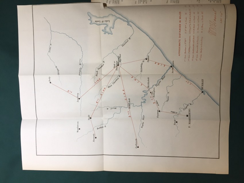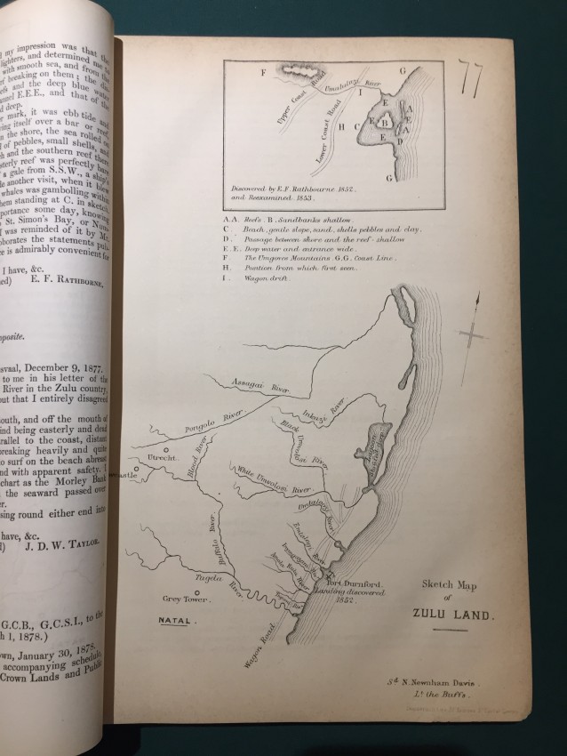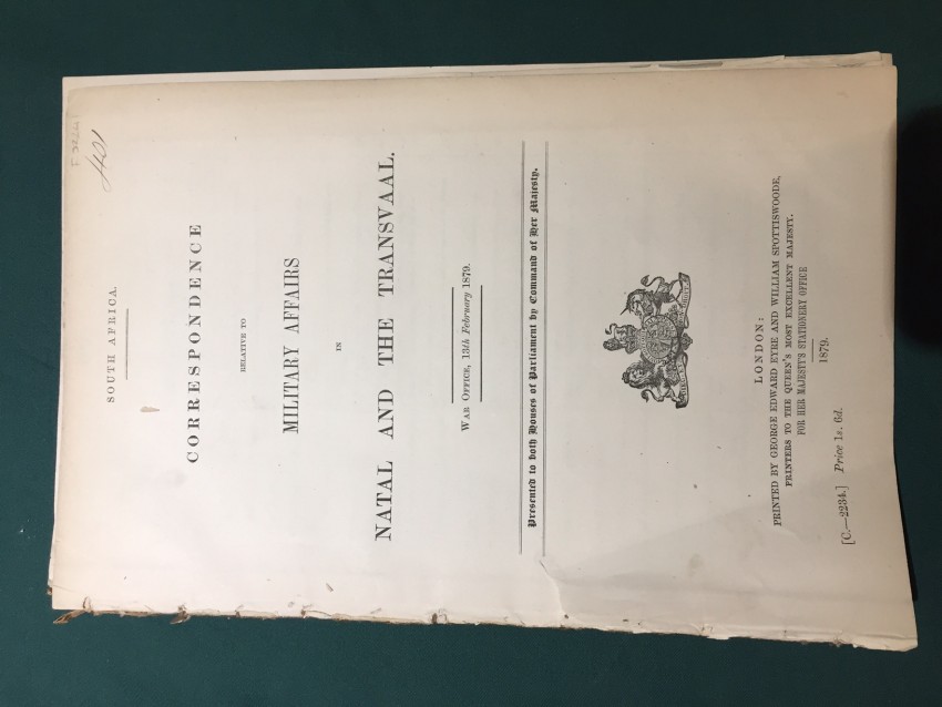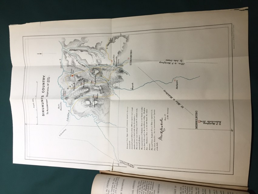 South Africa. Correspondence relative to the Military Affairs in Natal and the Transvaal. War Office, 13th February 1879. Presented to both Houses of Parliament by Command of Her Majesty. pp.41. Folding coloured maps (overall 49.3 x 41.6cm) Natal, from Surban (S) to Lake St Lucia (E) to Derby (N) and Ladismith (W). (Overall 55.6 x 37cm.) “Sikukuni’s Country. To accompany Despatch No. 10778.” [52241]
