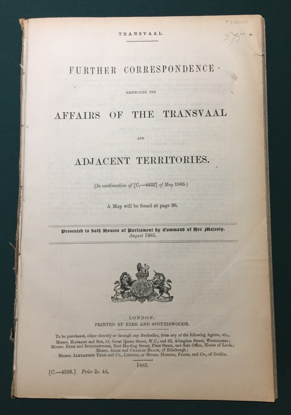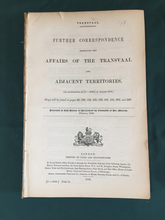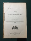 Transvaal. Further Correspondence respecting the Affairs of the Transvaal and Adjacent Territories. (In continuation of [C.-4432] of May 1885.) Presented to both Houses of Parliament by Command of Her Majesty. February 1886. pp.viii+251. Folding coloured map (overall 55.1 x 67.2.cm.) “Sketch map showing Territories claimed by Khama, Sechele & Gasitsiwe.” [52197]