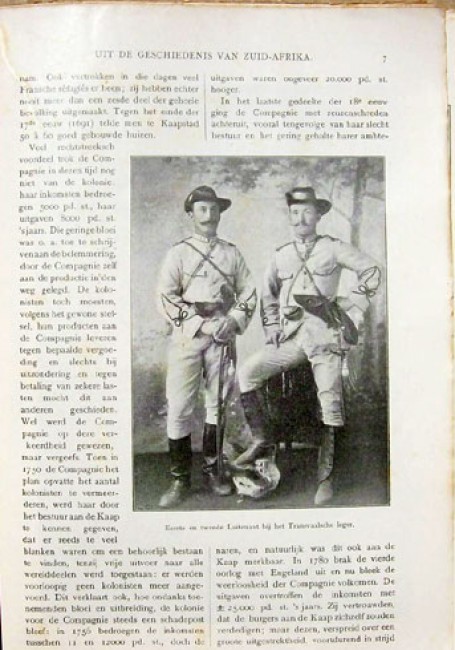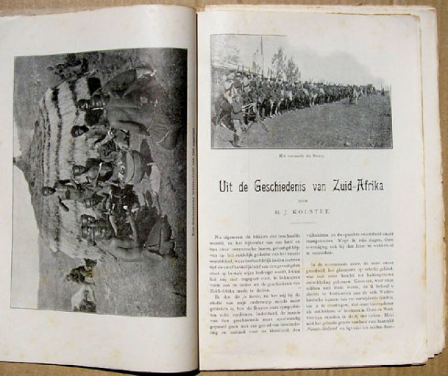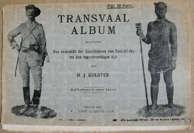 A 32 page pamphlet with grey coloured pictorial wrappers printed in black. A brief history of South Africa and the Transvaal with 31 black and white illustrations and a map. There is no direct Boer War material, but rather a sketck of the background to war. Published by N.J.Boon, who was a publisher of illustrated magazines. See lot 122 for another magazine publication by N.J. Boon, "De Oorlog in Zuid-Afrika."