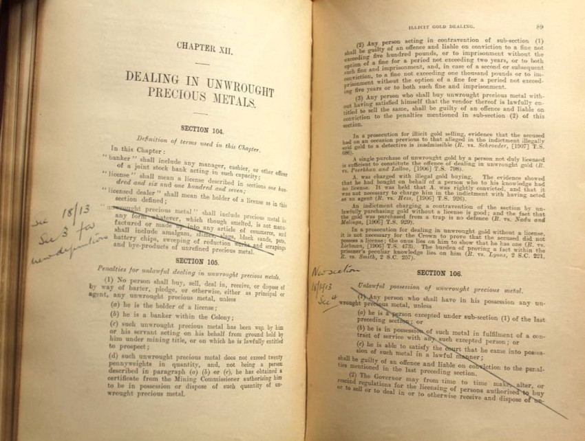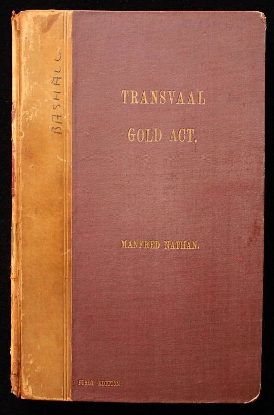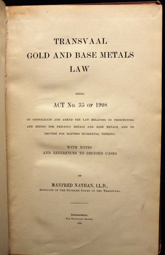 'Transvaal Gold and Base Metals Law, being Act No. 35 of 1908, to consolidate and amend the law relating to prospecting and mining for precious metals and base metals, and to provide for matters incidental thereto, with notes and references to decided cases by Manfred Nathan, LL.D., Advocate of the Supreme Court of the Transvaal.'