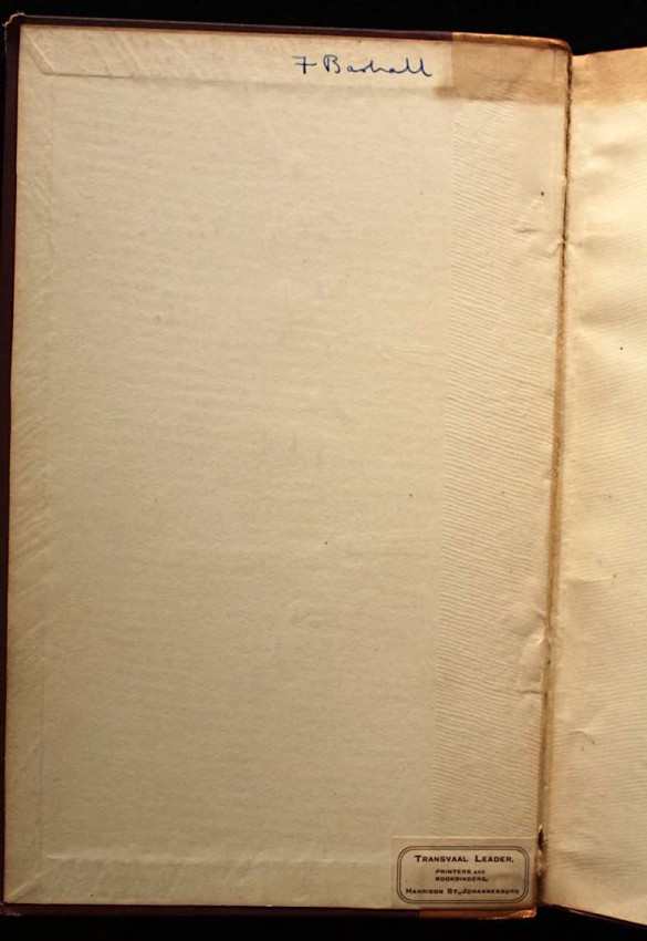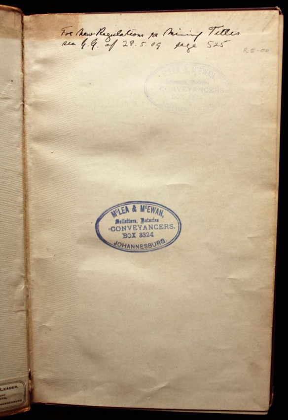Original "Transvaal Leader" bookseller's ticket on front paste down. Former copy of F. J. Bashall who was an author of articles relating to mining law as well as the editor of Surface Use in Mining Law. Bashall's signature is neatly written at the top of the front paste down as well as on the front and rear panels. Prior to Bashall's ownership this copy belonged to the early Johannesburg law firm McLea & McEwan - Solicitors, Notaries, Conveyancers. Their old rubber stamp is on the front endpaper.