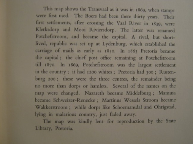 Augmenting the text is a frontispiece map of the South African Republic in 1868, the year before stamps were first used. This is an extract from the informative and long caption: \"In 1969, Potchefstroom was the largest settlement in the country; it had 1200 whites; Pretoria had 300; Rustenberg 200; these were the three centres, the remainder being no more than dorps or hamlets.\"