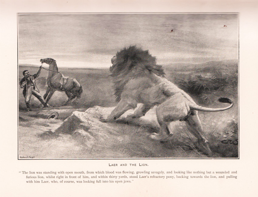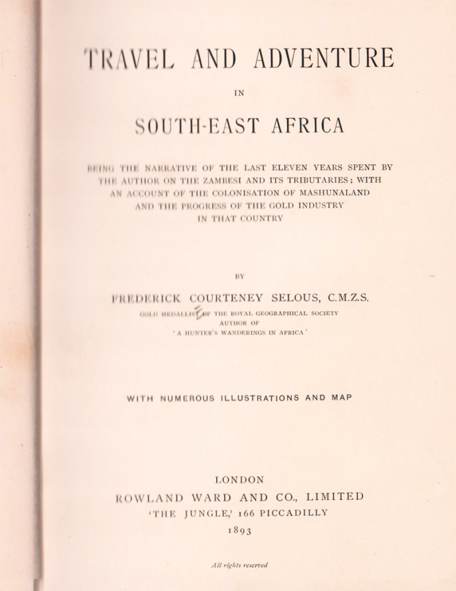 Czech (Dr Kenneth) An Annotated Bibliography of African Big Game Hunting Books 1785 to 1999, page 251-252: 'In this work recounting eleven years of exploration, work and sport in the 1880's and 1890's, Selous describes numerous adventures with lions and leopards, particularly near the Zambezi, Zweswi, and Manyami Rivers, with additional sport after rhinoceros, eland and hartebeest. After returning to the Transvaal, he linked with Montague Kerr and travelled into Matabeleland. Selous hunted more lions and rhinoceros, and vividly depicts an elephant hunt near the Zweswi River. In 1886, he hunted through Mashonaland, but was forced to escape after his camp was destroyed by hostile tribesmen. Eventually reaching the Zambezi, he hunted lion and lost a canoe to a hippopotamus. He concludes with a chapter on rifles, and another reflecting earlier sporting adventures after elephant, rhinoceros, buffalo and others.'