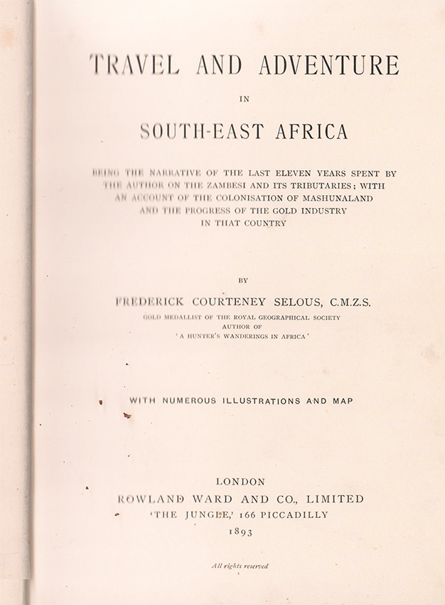 Mendelssohn (Sidney) South African Bibliography vol 2 page 300: After a short visit to England in 1881, Selous returned to South Africa in order to make collections of specimens of some South African fauna for the " British Museum " and the " South African Museum," &c. He was thus engaged from 1882 to 1887, and the first nine chapters of this volume are devoted to a narrative of his experiences with the Boers and the natives while engaged in his hunting expeditions, together with some account of the native wars and the raids of the Matabeles.