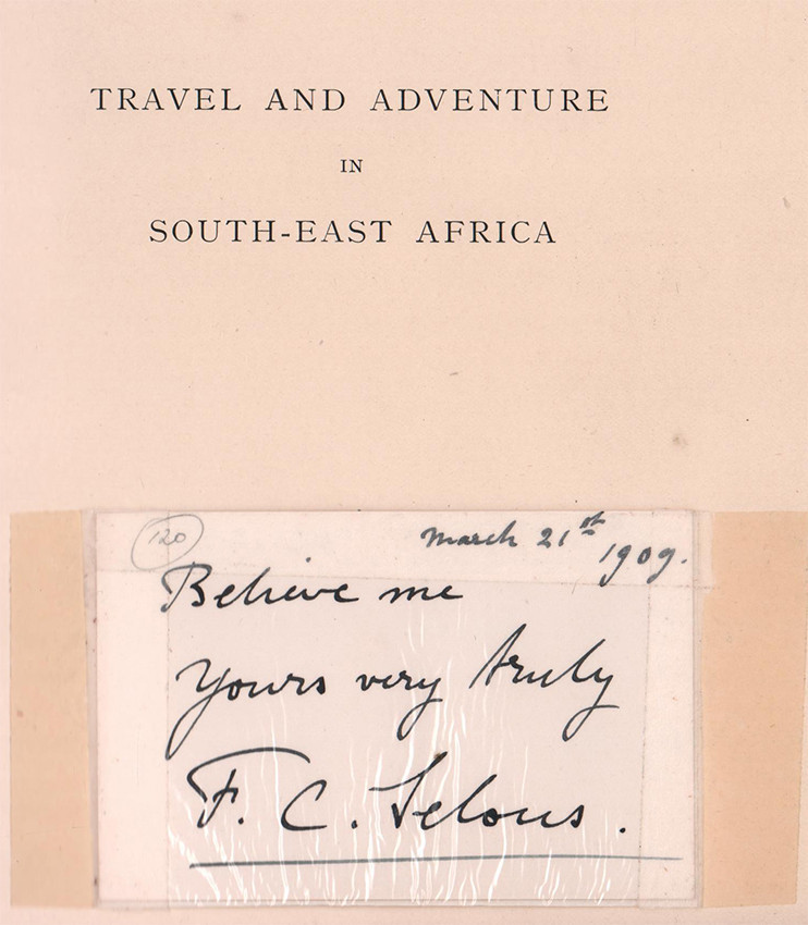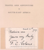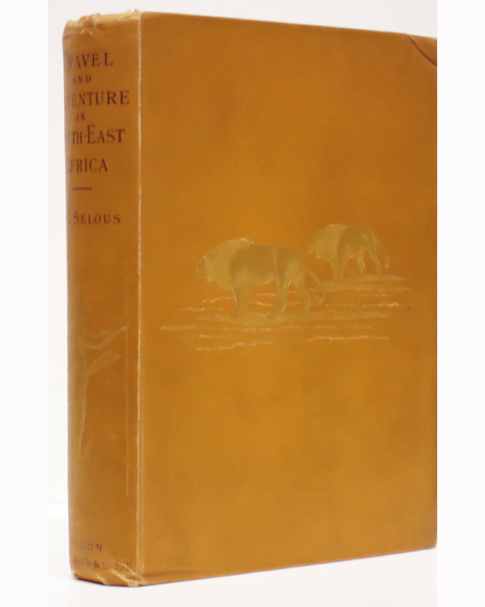 First edition: 503 pages, frontispiece portrait of the author with a facsimile signature, colour folding map, 22 plates, 35 illustrations in the text, original orange cloth with gilt vignettes on the upper cover and back, edges uncut (foxed), a card bearing a facsimile of Selous' signature is taped at the base of the half title page, a very good copy.