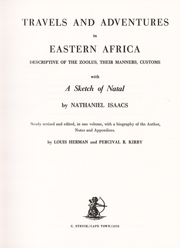 Louis Herman: “What is known of the life story of Nathaniel Isaacs presents a strange contrast to the background of respectable, bourgeois, Anglo-Jewish families of Kent whence he issued. Natal pioneer and explorer, ivory hunter and trader, temporary subject of the ferocious Zulu tyrant, Chaka, and courtier at the Great Kraal, this would-be empire builder begins a fresh career at the age of 24 on the west coast of Africa. There as merchant and shipper and proprietor of a tiny island, his activities, not all creditable, are hardly less remarkable; and in the end, he retires and settles down in England two years before his death as "Nathaniel Isaacs of Kentville, Egremont, in the County of Chester, Gentleman."