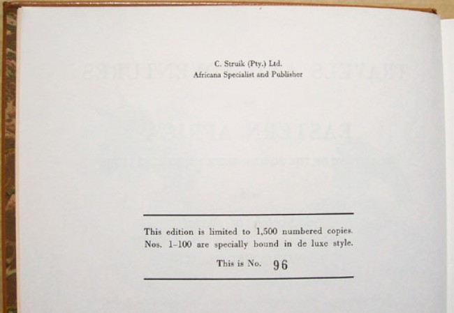 This edition with the de luxe binding was limited to 100 copies, of which this is number 96. Newly revised and edited in one volume, with a biography of the author, notes and appendices by Louis Harman and Percival R. Kirby. See image of binding, which has gilt titling and decorations on the spine, and decorative gilt borders on the boards, with the publisher's device on the upper board. See images of the original dust jacket. Marbled paper motif end papers. xxxi prelims, 349 pages, 5 colour plates, 10 monochrome plates and a fold out map.