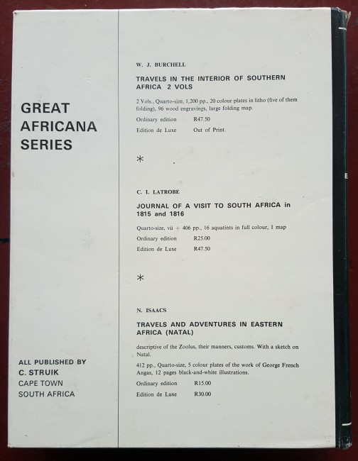 Newly revised and edited in one volume, with a biography of the author, notes and appendices by Louis Harman and Percival R. Kirby. Limited to 1500 copies, this is no. 753. xxxi, 349 pages, 5 colour plates, 10 monochrome plates and a fold out map. The dust jacket has slight wear to the head and foot of the spine, residue of tape marks on endpapers.