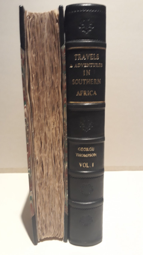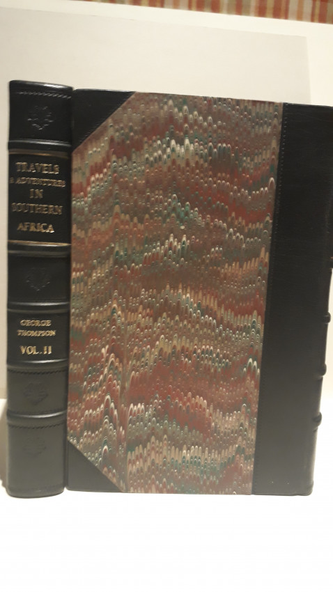 Recently & beautifully half-bound in green (Russell Oasis) leather with suitably matching greenish non-pareil marbled paper boards. Fitted hand-made paper endpapers. Labelled spines with embellished spine panels and a cats tooth roll along all leather edges. Contents crisp. The frontispiece of Table Mountain has a small ink stain at top centre; Plan of Graaff Reinet has a light water stain as do vignettes in pp 23 & 52 in V1; the map has a diagonal tear in the Indian Ocean that has been professionally restored. An attractive set.