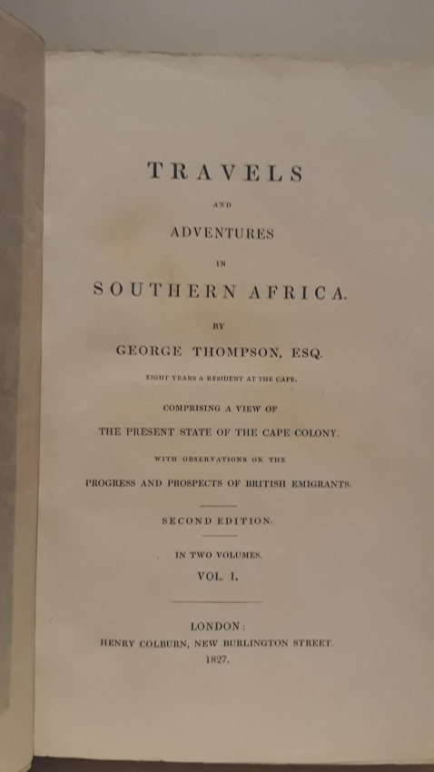 Second Edition: 2 volumes, 450 + 430 uncut pages;Volume 1, aquatint frontispiece, a view of Cape Town; Volume 2: folding aquatint frontispiece view of Table Mountain from the Parade; folding map with Thompson’s route; folding plans of Graaff Reinet and Cape Town; 22 plates; 17 engraved vignettes.