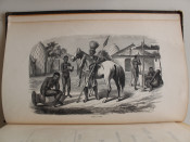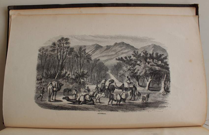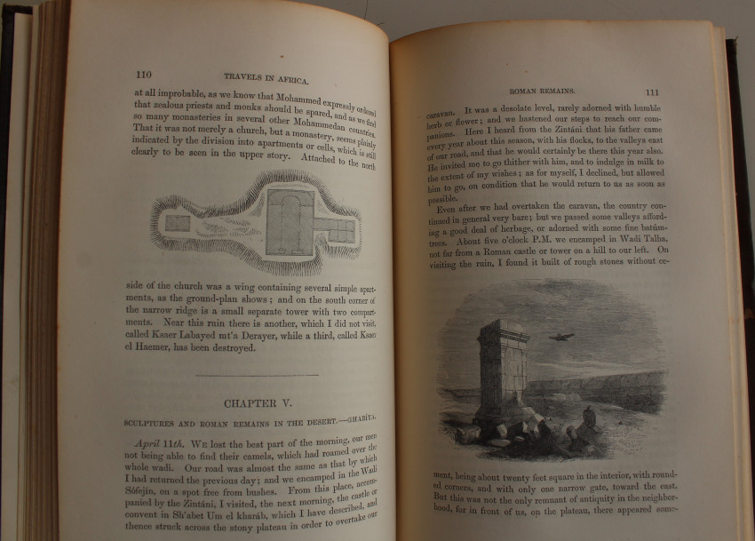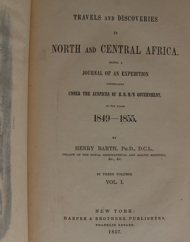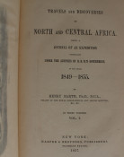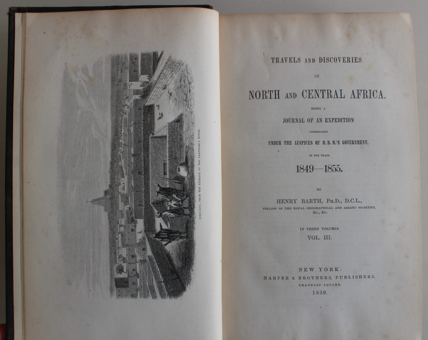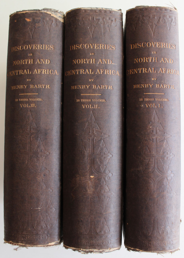 Being a Journal of an Expedition undertaken Under the Auspices of H.B.M.’s Government in the years 1849 – 1855. First American edition: 3 volumes: I. xxvii,657. II. xiii, 708. III. xvi, 800 pages, wood engraved frontispiece in each volume and numerous wood engraved plates and illustrations, coloured folding map, original blind stamped brown cloth – worn along the edges and with some insect damage, the gilt titling on the spines is dull, the contents are bright. Heinrich Barth (February 16, 1821 – November 25, 1865) Early in 1850, with the explorer James Richardson and the geologist and astronomer Adolf Overweg, he set out from Tripoli across the Sahara on a British-sponsored expedition to the western Sudan (a term then in use for most of central West Africa). When Richardson died a year later in what is now northern Nigeria, Barth assumed command. He explored the area south and southeast of Lake Chad and mapped the upper reaches of the Benue River. Overweg died in September 1852, and Barth traveled to the city of Timbuktu, now in Mali. He remained there for six months before returning, via Tripoli, to London (1855). Despite ill health and the loss of his colleagues, he had traveled some 10,000 miles (16,000 km), laid down accurate routes by dead reckoning, and returned to Europe with the first account of the middle section of the Niger River. His four large volumes, Reisen und Entdeckungen in Nord- und Central-Afrika in den Jahren 1849 bis 1855 (1857–58; “Travels and Discoveries in North and Central Africa in the Years 1849–1855”), remain one of the most comprehensive works on the area and contain an immense amount of anthropological, historical, and linguistic information as well as the daily travel details he so assiduously recorded. His work was honoured and rewarded financially by the British government. Later travels took him to Turkey and Asia Minor as well as to Spain, Italy, and the Alps. He was appointed professor of geography at the University of Berlin (1863). from Encyclopedia Britannica.