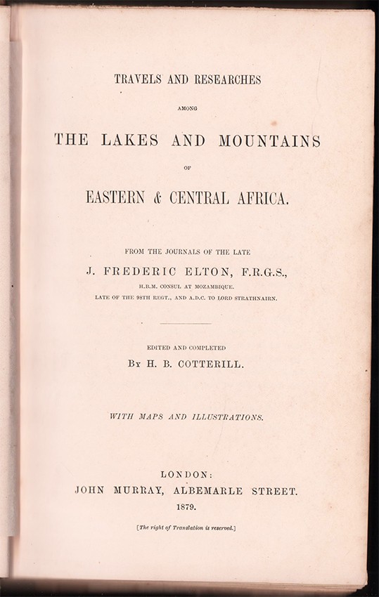 Czech (Kenneth) An Annotated Bibliography of Big Game Hunting Books 1785 - 1999 page 91-92: 'The British consul to Mozambique, Elton spent considerable time fighting the slave trade in the region. He explored the region around Lake Nyassa and enjoyed considerable sport after elephant, hippopotamus, impala, eland, black rhinoceros and buffalo. His descriptions of hunting with his two rifles, "Big Henry" and "Little Henry," are particularly vivid. During his return to the coast, he contracted fever and died. His journals were arranged, edited and completed by his hunting companion, H.B. Cotterill'.