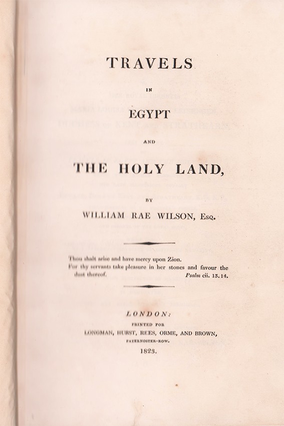 William Rae Wilson(1772–1849), author of 'Travels', was a member of a Haddington family named Rae, and was born in Paisley on 7 June 1772. He learned law under his uncle, John Wilson, town clerk of Glasgow, and for a time practised as a solicitor before the supreme courts of Scotland. His uncle, who died in 1806, left him his fortune, and he then, by letters patent, added Wilson to his name, and resolved to gratify a taste for travel, specially stimulated at the moment by his wife's premature death. He travelled in Egypt and Palestine, and through most of Europe, preparing as he went minute and interesting records of his experience.