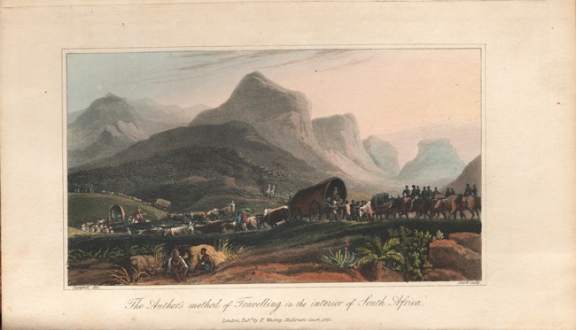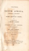 ‘Upon the death of Dr J.T. van der Kemp the London Mission Society sent Campbell to South Africa to visit and report on their mission stations. Campbell was the first missionary traveller to undertake a long journey into the interior, visiting far-flung missions. From Bethalsdorp he went to Graaff Reinet where he met the traveller W.J. Burchell. Finally after crossing the Orange River he reached Klaarwater mission station and advanced to Lattakoo and beyond, north-west of Malapeetze. When he was returning from this first journey of 4,800 kilometres, Campbell followed the South Bank of the Orange River for 960 kilometres, 480 kilometres on foot, in a region little known to Europeans. Having reached Pella he turned south via Silwerfontein where Cornelius Kok lived and where he received valuable information about Namaqualand, Damaraland and the Bushmen. He also brought back natural history and geological specimens for the L.M.S, museum. In November 1818 Campbell, accompanied Dr John Philip aboard the Westmoreland, made his second voyage to Cape Town. He, Philip and Robert Moffat visited the eastern part of the Colony until halted by the Fifth Frontier War (1818-19). He then set out on his second journey into and beyond the known interior, proceeding further north than in 1812 via the Orange River to Griqua Town and Lattakoo. He returned to Cape Town where he remained for several months before returning to England in November 1820. Dictionary of South African Biography, volume 3, pages 127-8.