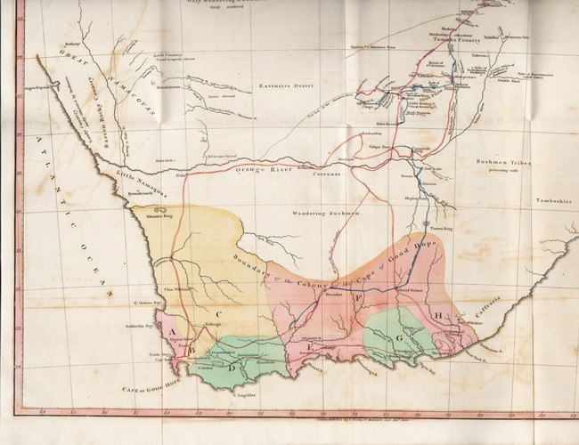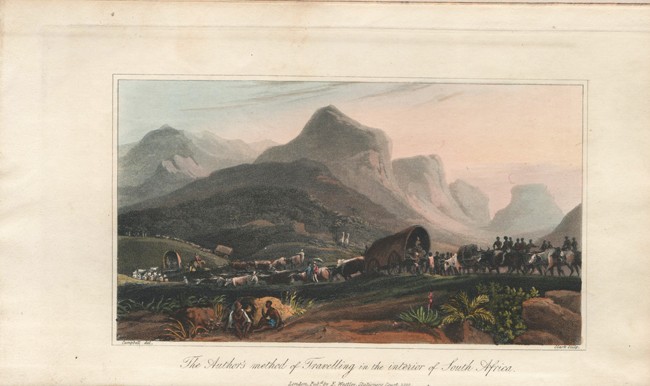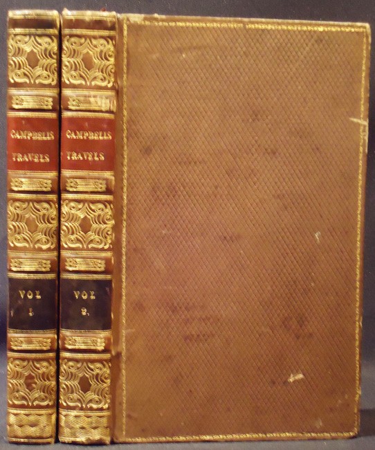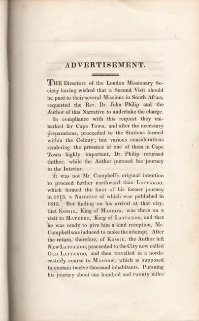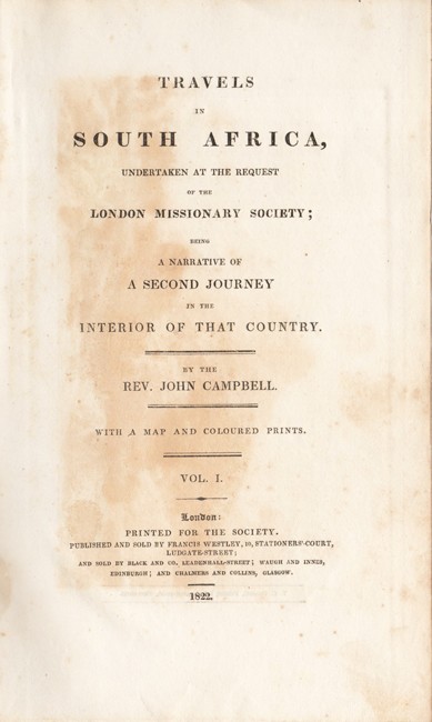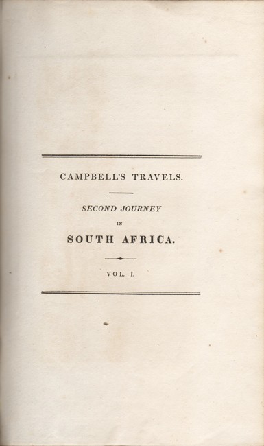 ‘Upon the death of Dr J.T. van der Kemp the London Mission Society sent Campbell to South Africa to visit and report on their mission stations. Campbell was the first missionary traveller to undertake a long journey into the interior, visiting far-flung missions. From Bethalsdorp he went to Graaff Reinet where he met the traveller W.J. Burchell. Finally after crossing the Orange River he reached Klaarwater mission station and advanced to Lattakoo and beyond, north-west of Malapeetze. When he was returning from this first journey of 4,800 kilometres, Campbell followed the South Bank of the Orange River for 960 kilometres, 480 kilometres on foot, in a region little known to Europeans. Having reached Pella he turned south via Silwerfontein where Cornelius Kok lived and where he received valuable information about Namaqualand, Damaraland and the Bushmen. He also brought back natural history and geological specimens for the L.M.S, museum. In November 1818 Campbell, accompanied Dr John Philip aboard the Westmoreland, made his second voyage to Cape Town. He, Philip and Robert Moffat visited the eastern part of the Colony until halted by the Fifth Frontier War (1818-19). He then set out on his second journey into and beyond the known interior, proceeding further north than in 1812 via the Orange River to Griqua Town and Lattakoo. He returned to Cape Town where he remained for several months before returning to England in November 1820.’ Dictionary of South African Biography, volume 3, pages 127-8.
