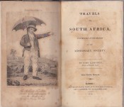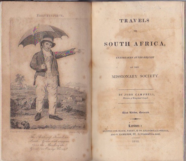 Later he went on to Bethelsdorp where he met Mr Read (Van der Kemp's successor) and together they travelled to Grahamstown and Graaf Reynet (sic). He met Burchell en route to the Orange River and the Northern Cape (Pella). On page 330 writing about Northern Namaqualand, he describes staying with the elderly Mrs Vandervesthuis in the Kamma mountains. The lady said she had given LeVaillant 'a good drubbing with a sambuck for speaking improperly of her daughters' when LeVaillant visited the area some years before. Appendix X has interesting ethnographic information about the Xhosa people, Madagascar and Mauritius in the early 19th century. Appendix VII has the Lord's Prayer in both Hottentot and Coranna languages. In Appendix XIII and XIV Campbell sharply criticises Lichtenstein's and Maria Graham's books in which they describe the situation in South Africa in 1812.