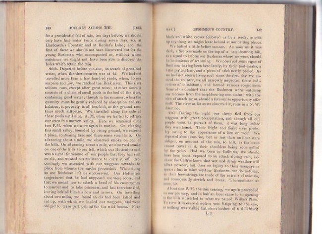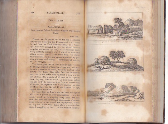 Frontispiece portrait of Campbell at Orange River. Frontispiece, folding map plus nine plates. Plates IV and V on same folding page. Pages [i-v]vi-xv[xvi] 1-400. Page 400 ends with directions to the binders.