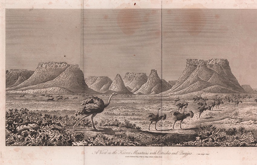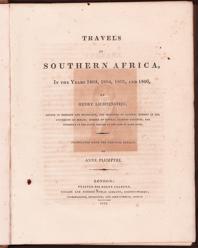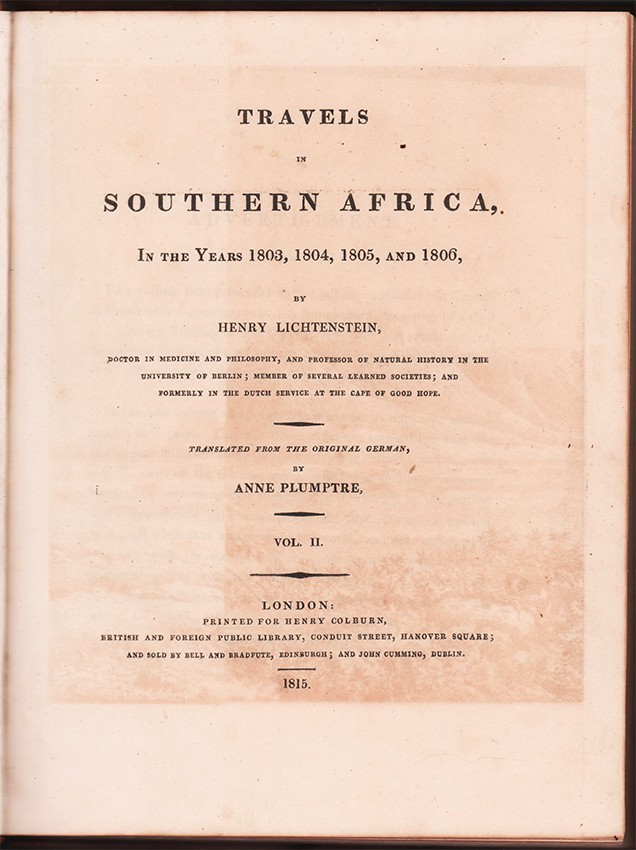 Mendelssohn (Sidney) South African Bibliography vol. 1 page 899: Dr Lichtenstein was tutor to the son of Governor Janssens of the Cape Colony. The author offers a criticism of Barrow in his references to earlier travellers, accusing him of being 'totally unacquainted with the general habits and mode of life of the colonists...' Lichtenstein travelled with the Governor through the interior. Bushmen and Bechuanas are described and the information about the wild life and their natural surroundings is recorded in detail.