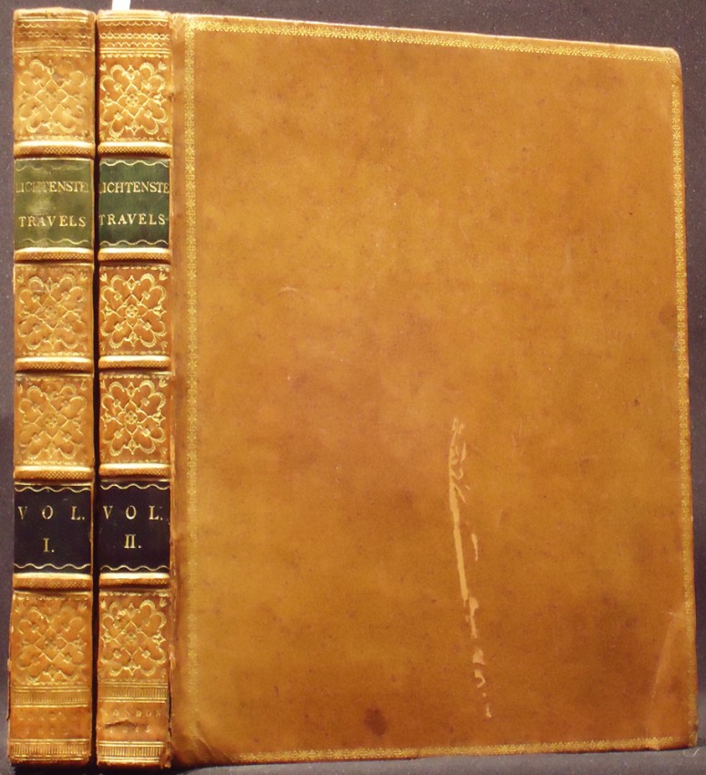 2 volumes: 383+(32) & 368+(28) pages, folding map in volume 2, engraved frontispiece portrait of Henry Lichtenstein in volume 1, with offsetting on the title page, folding frontispiece engraving in volume 2: 'A View of the Karree Mountains with Ostriches and Quaggas,' 6 engraved plates, full contemporary calf, decorated gilt on the spines, the text in volume 1 is a little browned but pages 225-232 (Signature Gg) are not as heavily spotted as usual but 328-345 (Signatures Uu & Yy) are affected by the usual foxing, the text in volume 2 is clean and bright, bookplates on front paste-down endpapers, silk markers, there is a scratch on the leather on the upper cover of volume 2, a very good set.
