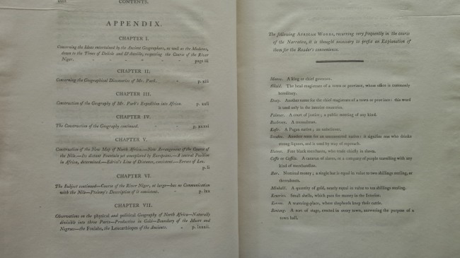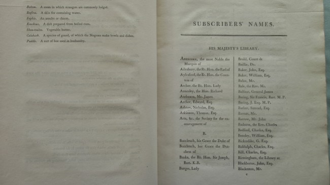 The xxviii pages of prelims includes a glossary and a list of nearly 400 subscribers (including the Royal and other libraries, Sir Joseph Banks, John Barrow, the Earl of Chesterfield, Lord Dundas, James Fox, Lord Palmerston and William Wilberforce) + 372 pp of text and vocabulary + 2 pp of words and music + an appendix of xcii pages + an engraved frontispiece and 5 other inserted engravings + 3 folding maps.