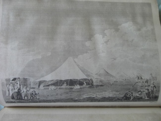 The frontispiece and other engravings are pasted in. There is light offset from the frontispiece to the title-page. The three maps are present and undamaged, save that the second map, at the beginning of the appendix, needs to be refolded as it is now proud of the text-block with the 0.5-1.5 cm exposed part sunned.