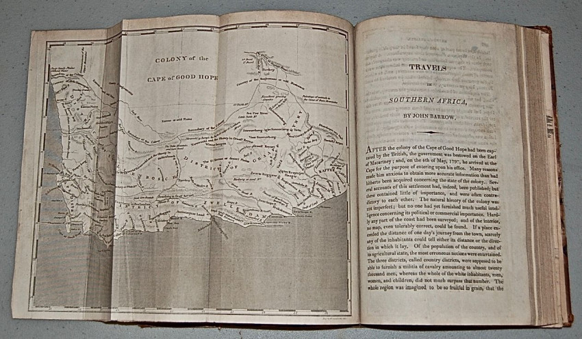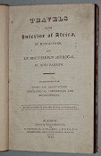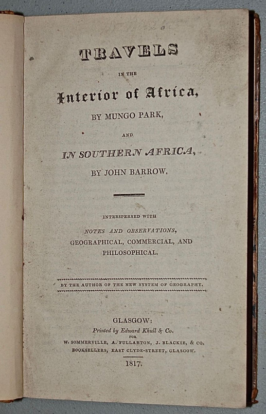 Glasgow: W. Sommerville, A Fullarton, J. Blackie, 1817. First edition (pp. 479). Octavo (21 cm) in quarter leather over marbled boards; six illustrations (portrait of Park, Kamalia, Bridge over… Black River, map of colony of Cape of Good Hope, two portraits of local inhabitants, the ‘Gnoo’ and broad-tailed sheep, but not including map showing Park’s route— we have the gnoo and sheep in its stead). Covers rubbed and flaked, pp. 343/344 damaged with small loss to text— as the damaged text on both pages refers explicitly to the ‘covering a [Hottentot man] fastens around his waist… for the purpose of receiving those… [Na]ture has taught them to conceal’ and, similarly at p. 344, where it is noted women of lesser fortune ‘have not the triangular piece of skin be[hind]…. [T]hey always wear a sheep skin round the waist, which desce[nds as] low as the middle of the legs’, it appears a misguided do-gooder may have been at work (the portrait page is marked with tabs as well). Nevertheless a decent, clean copy.