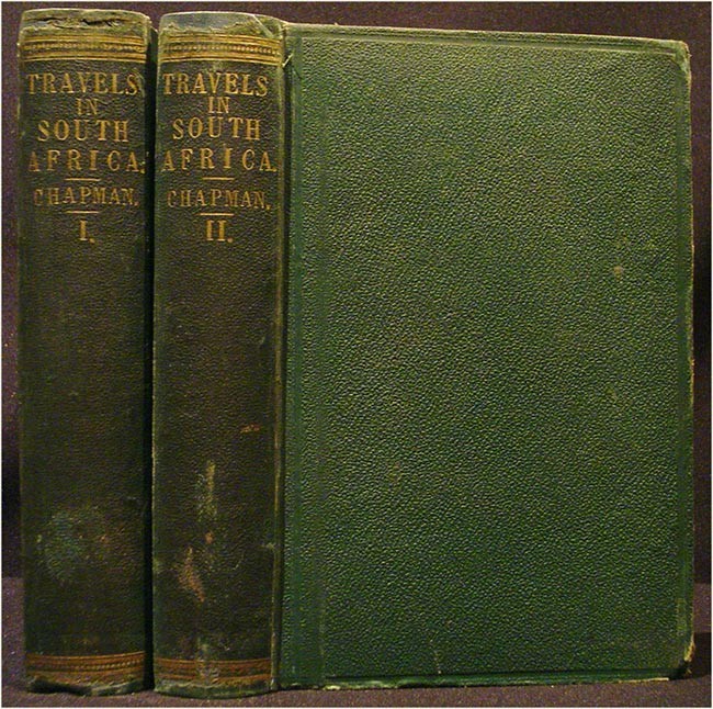 2 volumes, 454 + 480 pages, wood engraved frontispiece in each volume, 2 folding maps partly coloured and Chapman\'s journeys traced in red, 8 plates and 19 illustrations in the text, errata leaves in each volume, original green pebble-grained cloth, titled gilt on the spines, both volumes have been recased (new endpapers), edges slightly worn and corners bumped. The large folding map at the beginning of volume I has been strengthened at each fold, the second folding map in volume II (route from Walvisch Bay to Sanamani’s Town via Lake Ngami and The Victoria Falls in 186– 3) is in good condition, generally the contents are bright.