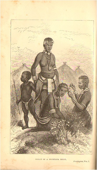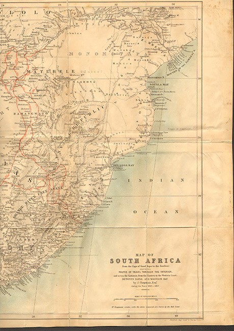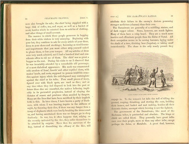 Mendelssohn (S.) A South African Bibliography, volume 1, pages 321-2. \'Starting from Natal, Mr Chapman traversed the eastern portion of the Orange Free State by three distinct routes, and pursuing his travels through the Western Transvaal and Bechuanaland, penetrated up to the almost unknown regions of Matableland. He also visited Walvisch Bay and Lake Ngami, and journeyed through the country of the Namaquas and Damaras.\' Kennedy, Africana Repository, page 40, \'Baines….then joined Chapman\'s expedition through South West Africa to the Victoria Falls….This expedition up to August 1862 he described in Explorations in South-West Africa (London 1864)….Chapman was very angry with Baines because he published first and had acquired fame by exhibiting his pictures of the Victoria Falls. In a preface to Chapman\'s book acknowledgement is made to Charles Bell \'for drawings and sketches used in illustrating these volumes\'. Some of the illustrations are undoubtedly after Bell, who was not a member of the expedition; some of the pictures are by Baines, but without acknowledgement. It was a pity they quarrelled because they had been friends from their first meeting in Potchefstroom in 1850’.