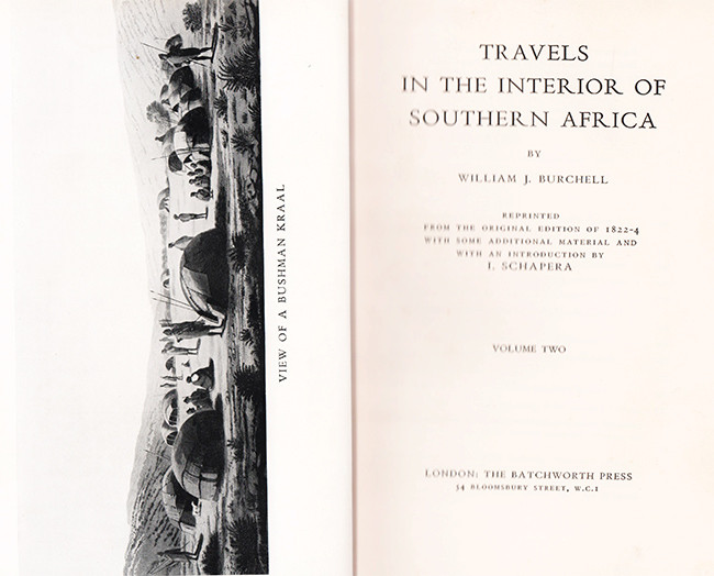 Limited edition: 2 volumes. 381 + 473 pages, frontispiece in each volume, volume one is a portrait of Burchell, 2 folding maps, 15 plates - 6 coloured, numerous vignettes, edges uncut - light foxing mainly on the fore-edge, top edge dyed blue, blue cloth with some marks on the covers, titled gilt on the spines, a very good set.