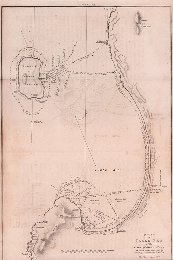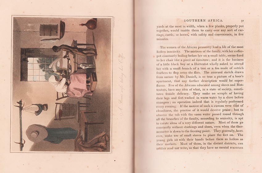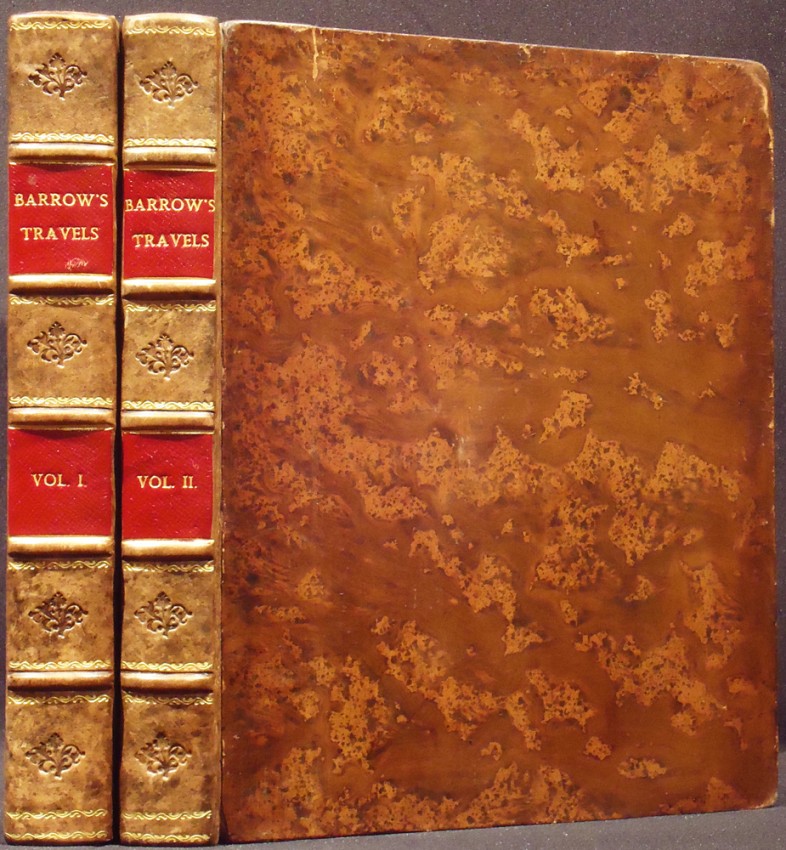 Second edition: 2 volumes, 427 + 372 pages (+ directions to binder at the end of volume II), 8 hand-coloured aquatint plates by Samuel Daniell, large folding map coloured in outline, 8 folding charts and plans 2 of which are hand-coloured, the hand coloured plans in volume 2 starting to tear at the folds – the military plan of The Cape Peninsula has been repaired on the back with tape, contemporary full mottled calf rebacked – red title labels gilt on spine, uncut edges, usual off-setting on the two hand-coloured charts in volume II, overall a very good set of the second and best edition.