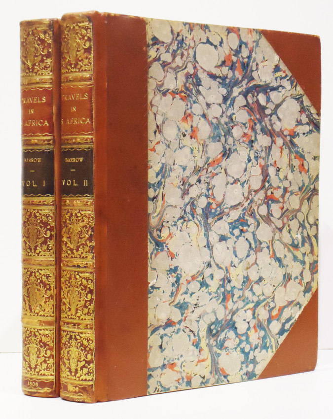 The second edition with additions and alterations illustrated with several engravings and charts. Second (and best) Edition: 2 volumes, xvi, 427 + 372 pages, 8 hand-coloured aquatint plates by Samuel Daniell, large folding map coloured in outline and lined with cloth, 8 folding charts and plans 2 of which are hand-coloured, half calf with matching marbled boards end papers and page edges, decorated in gilt on spine with red and black title labels, usual off-setting on the two hand-coloured charts in volume II, overall a very good set of the second and best edition