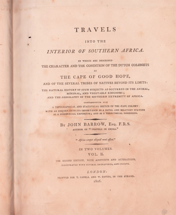 Mendelssohn (Sidney) South African Bibliography volume 1, pages 87 - 88. Barrow was attached to the staff of the Earl of Macartney, one of the governors of the Cape Colony during the first occupation by the British. Barrow accompanied an expedition from Cape Town to Graaff-Reinet, and another to Namaqualand, and he gives an excellent description of the country traversed, particularly with regard to the botany and zoology of these regions. He provides significant evidence of the alleged brutality of the Boers to their slaves and Hottentot servants, and there is a description of the characteristics, habits, and customs of the various native races. The second volume deals with the importance of the country from a military and naval perspective. The plates by Daniell are not present in the first edition.