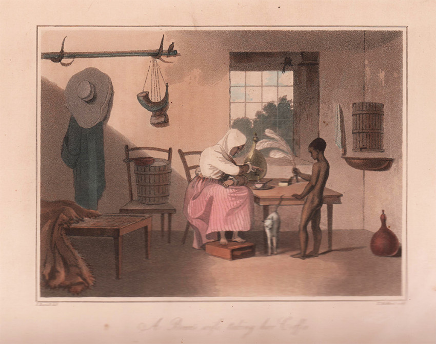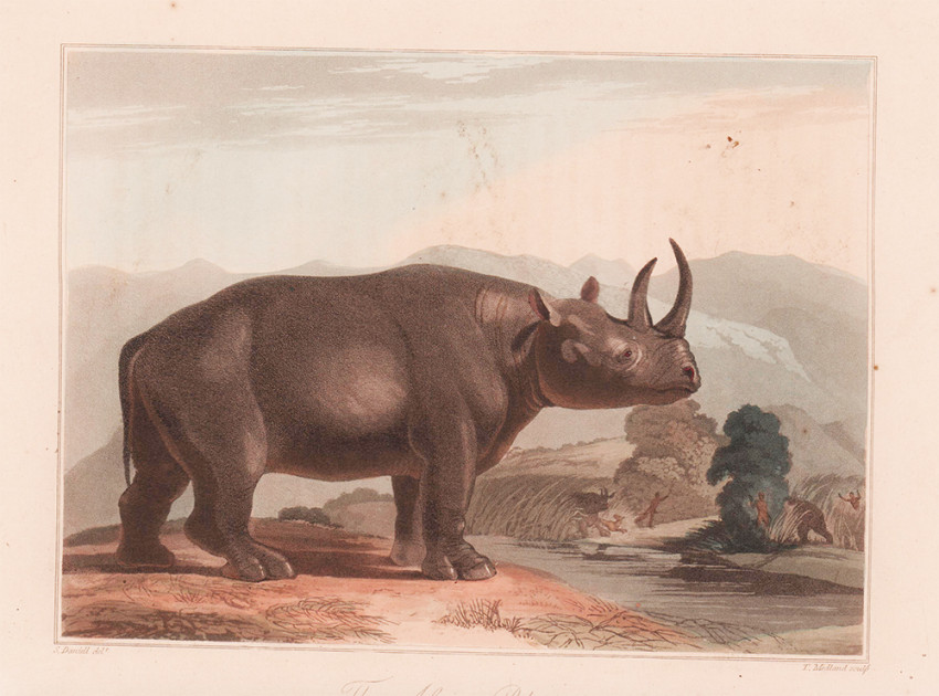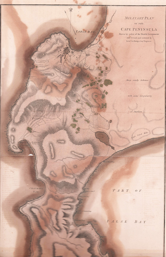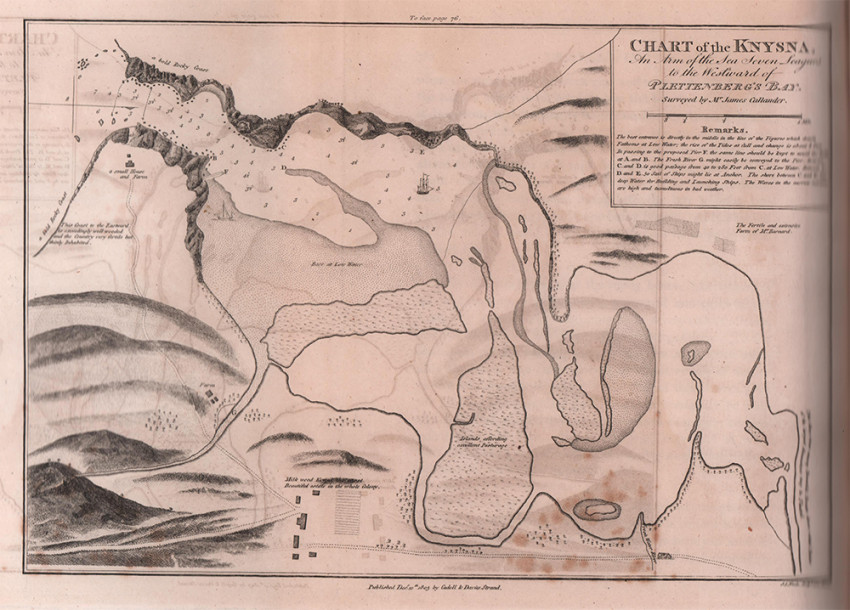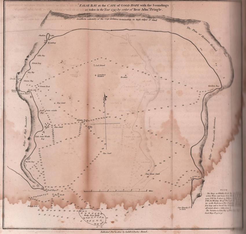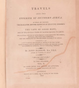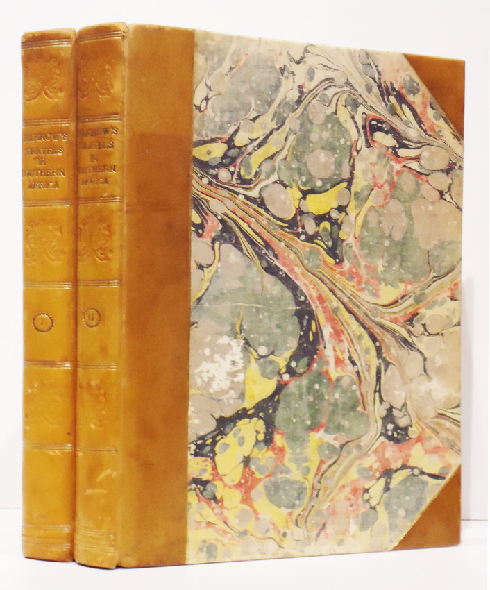 Second (and best) Edition: 2 volumes, 427 + 372 pages, 8 hand-coloured aquatint plates by Samuel Daniell, large folding map coloured in outline, 8 folding charts and plans 2 of which are hand-coloured, the military map of the Cape Peninsula opp. Page 222 has been repaired on the back with archival tape; pages 347-348 in volume 1 have a tear in the page, insect scarring on the front end papers in volume 1, half leather with marbled boards titled gilt on the spines, usual off-setting on the two hand-coloured charts in volume II, overall a good set of the second and best edition