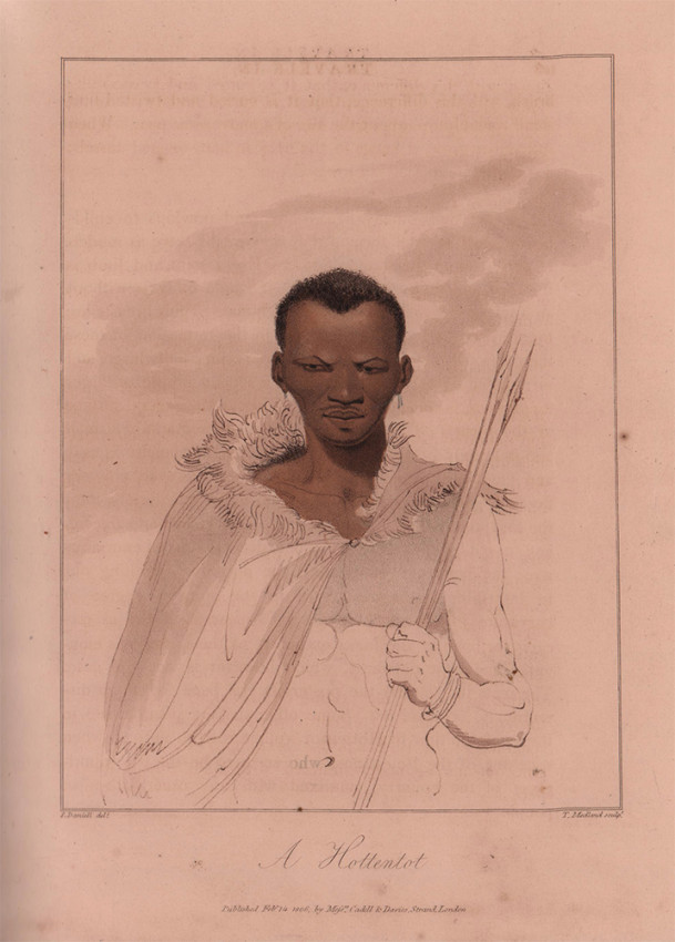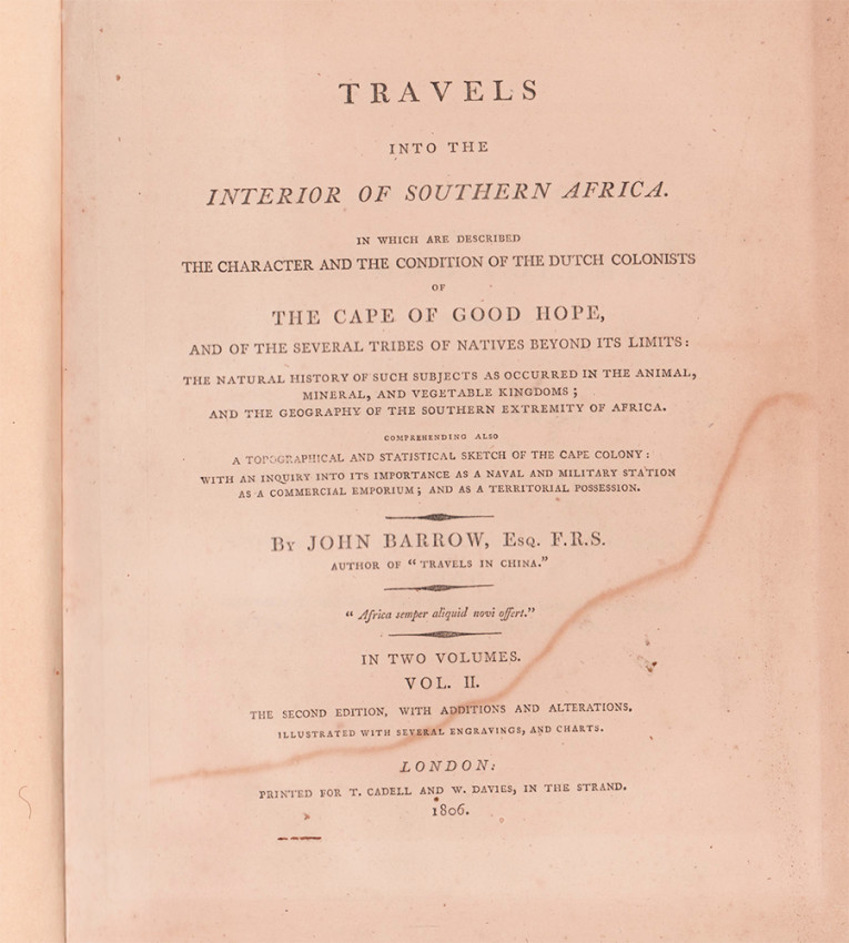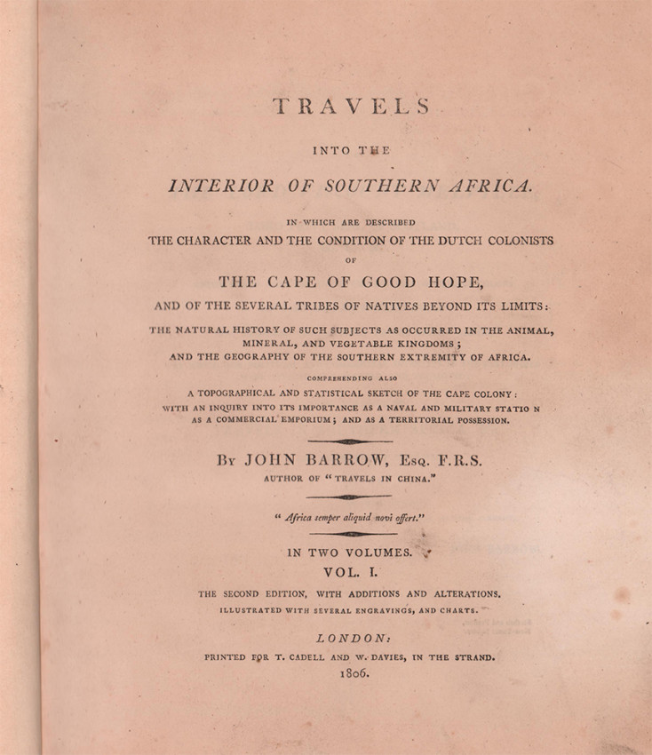 Mendelssohn (Sidney) South African Bibliography, volume 1, pages 87 - 88. Barrow was attached to the staff of the Earl of Macartney, one of the governors of the Cape Colony during the first occupation by the British. Barrow accompanied an expedition from Cape Town to Graaff-Reinet, and another to Namaqualand, and he gives an excellent description of the country traversed, particularly with regard to the botany and zoology of these regions. He provides significant evidence of the alleged brutality of the Boers to their slaves and Hottentot servants, and there is a description of the characteristics, habits, and customs of the various native races. The second volume deals with the importance of the country from a military and naval perspective. The plates by Daniell are not present in the first edition.