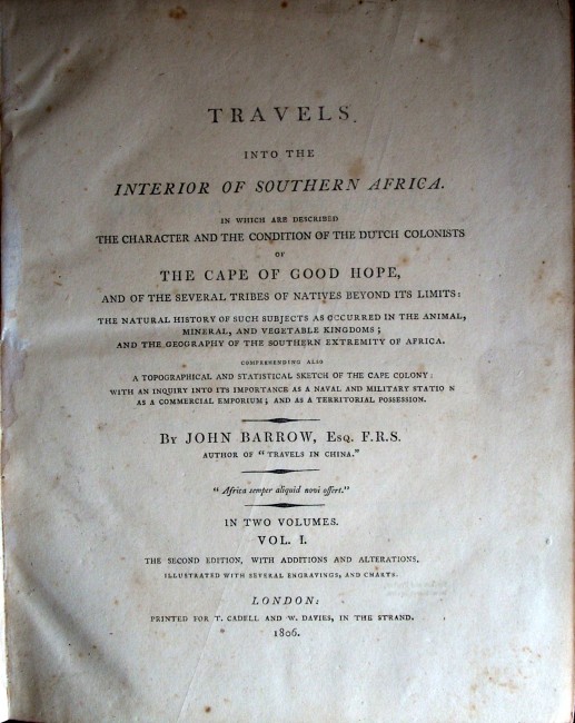 On another expedition he struck northwards into Bushman territory and explored the Sneeuwberg reaching the Orange River. As private secretary his wanderings had a political dimension but he was a keen observer, examining Bushman paintings (rock engravings), making topological observations and writing tribal reports. The result of these ' researches' are contained here (volume one:1801, volume two:1804). Barrow laid the foundation for South African geographical research. (Reuben Musiker, Deputy Librarian, 1961-1972, Rhodes University) [V.S. Forbes; The Expanding Horizon: a geographical commentary upon routes, records, observations and the opinions contained in selected documents concerning travel at the Cape (1750-1800)].