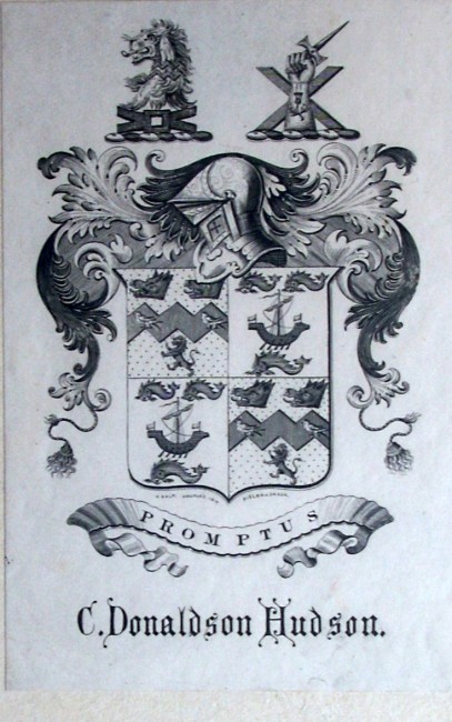 The bookplate is that of Charles Donaldson-Hudson (1840-1893), High Sheriff of Shropshire and Member of Parliament for Newcastle-under-Lyme .