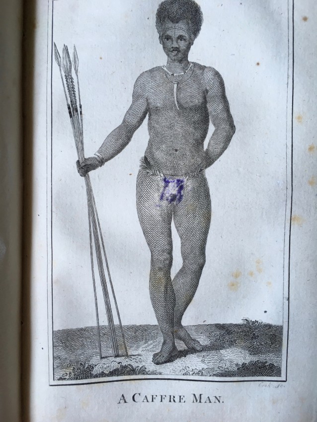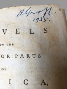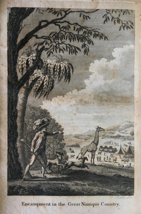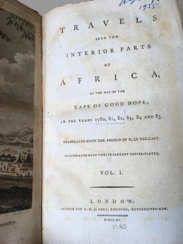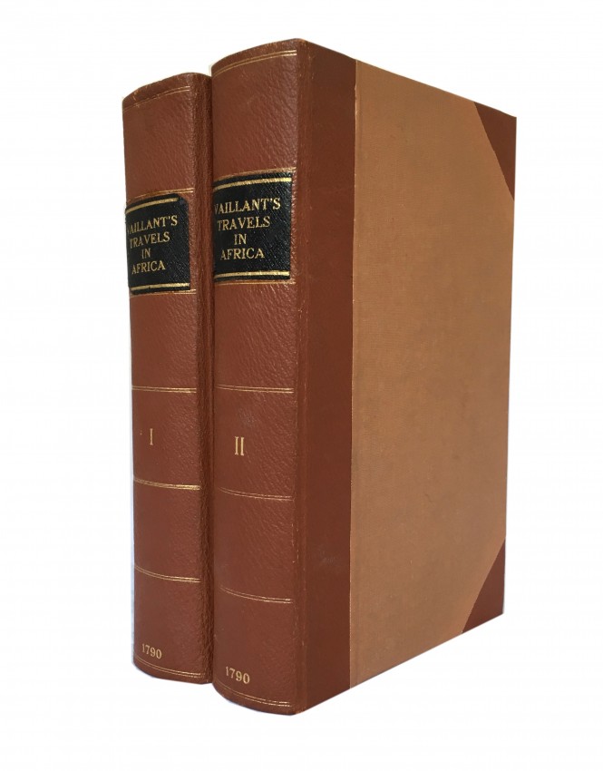 London: Printed for G.G.J. and J. Robinson, 1790. In two volumes. Translated from the French of M. le Vaillant. Illustrated with twelve elegant copper-plates. 2 volumes: I. xii, 395; II. 403 pages, 12 engraved plates – 2 folding (including the plate at page 350 in volume II of ‘A Hottentot woman’ which is sometime referred to as the ‘suppressed’ plate), no half title pages as called for, ‘Directions to Binder’ at page 404 in volume II, recased in three quarter leather with black title labels on spines. The cloth has minor flecks. Untrimmed, offsetting from frontispiece to title page, some dampstains to the first gathering of the first volume, minor foxing to the plates. Ogilvie (J.H.) A Bibliography of Le Vaillant’s Voyages and Oiseaux d’Afrique, Johannesburg Public Library 1982, no.24 (page 18), listed as the second London issue Binding Condition: Very Good Overall Condition: Very Good Size: 8vo (234 x 135 x 42mm)