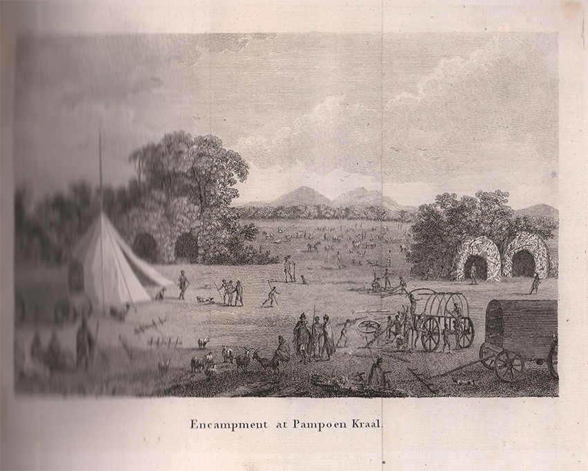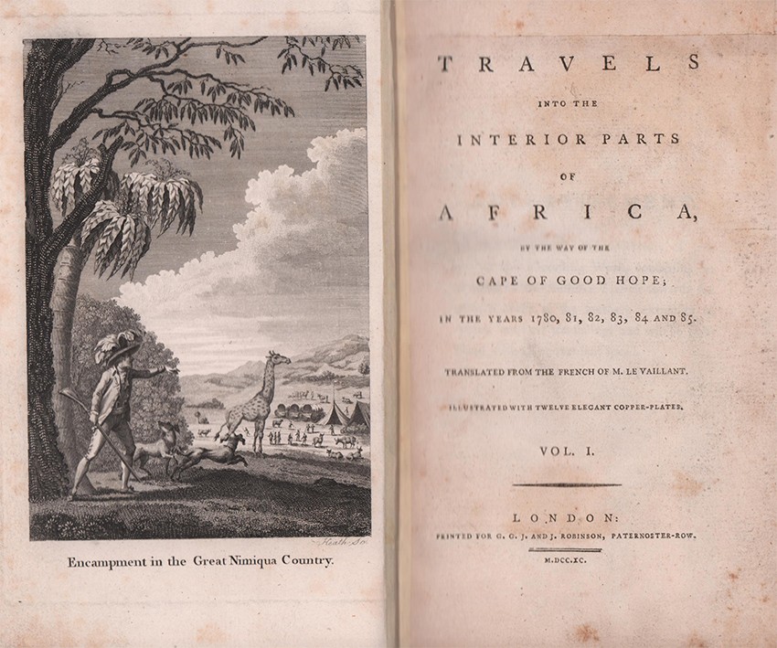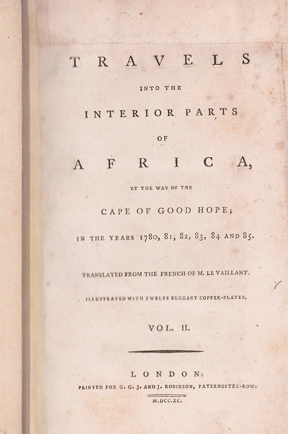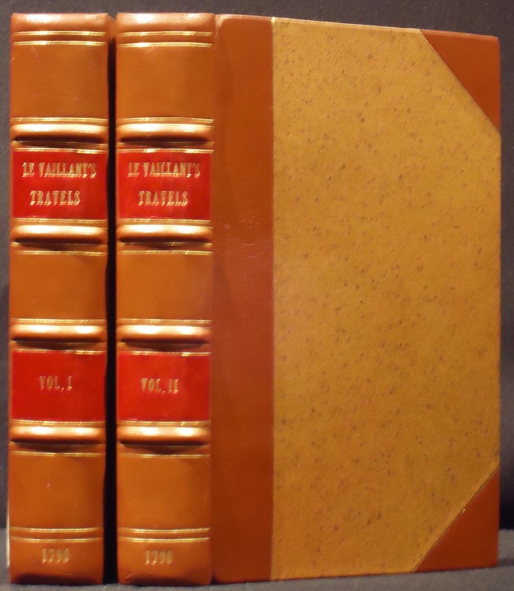 Second London issue: 2 volumes: I. xii, 395; II. 403 pages, frontispiece in volume 1 – Encampment in the great Nimiqua Country, 11 engraved plates – 2 folding (including the plate at page 350 in volume II of ‘A Hottentot woman’ which is sometime referred to as the ‘suppressed’ plate), ‘Directions to Binder’ at page 404 in volume II, modern half calf with sprinkled paper boards, red title labels gilt on spines, uncut edges, light foxing on several pages, spotting on the page edges, a very good copy.