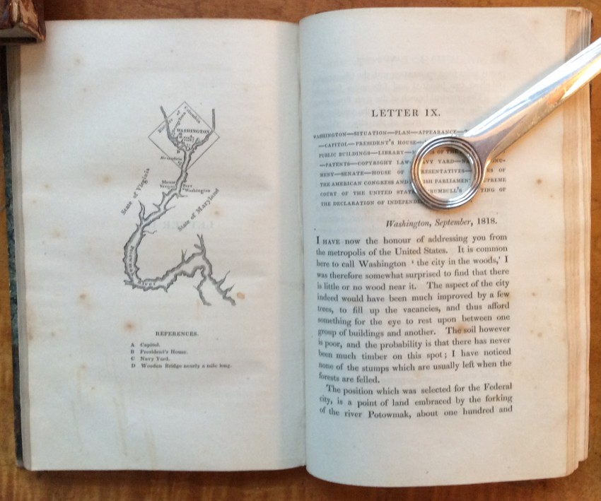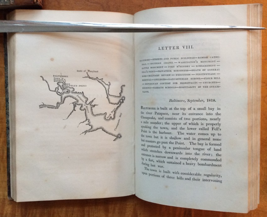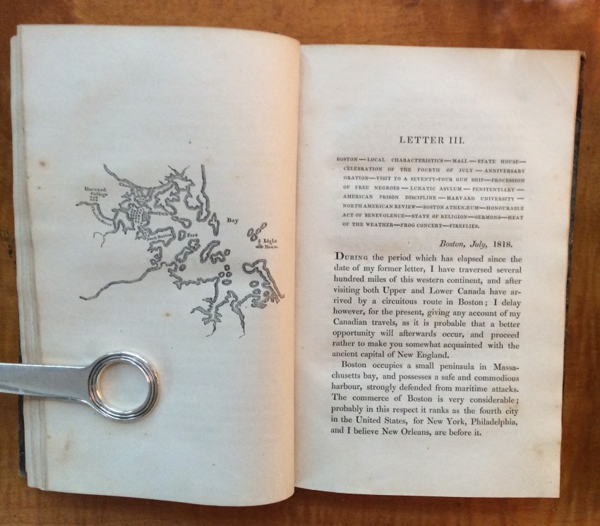 The useful and accurate wood-engraved and letterpress maps and plans are as follows: in vol.I, p.20 (New York city), 44 (Boston), 92 (Newhaven), 168 (Princeton), 184 (Philadelphia), 218 (Baltimore ), 250 (Washington, D.C.), 302 (Albany); in vol.II, p.30 (Niagara and environs), 36 (map of Niagara Falls), 110 (‘York’, Ontario), 112 (‘Kingston’, Ontario), 148 (Montreal), 174 (Quebec).