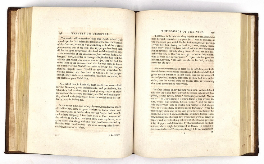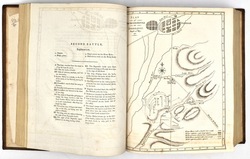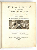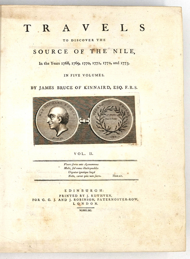 'From 1768 to 1772 Bruce was engaged in the adventures on which his fame depends. Traveling first up the Nile in 1769 and then along the Red Sea, he finally reached Massawa, the main port of what became the Eritrean province of Ethiopia. He spent the major portion of his Ethiopian period in and around Gondar, the imperial capital. This epoch coincided with political upheavals in the empire and the rise of provincial warlords, the chronicle of which is narrated at some length in Bruce's five-volume Travels to Discover the Source of the Nile (1790). He also discussed Ethiopia's history, monuments, art, geography, and natural history.