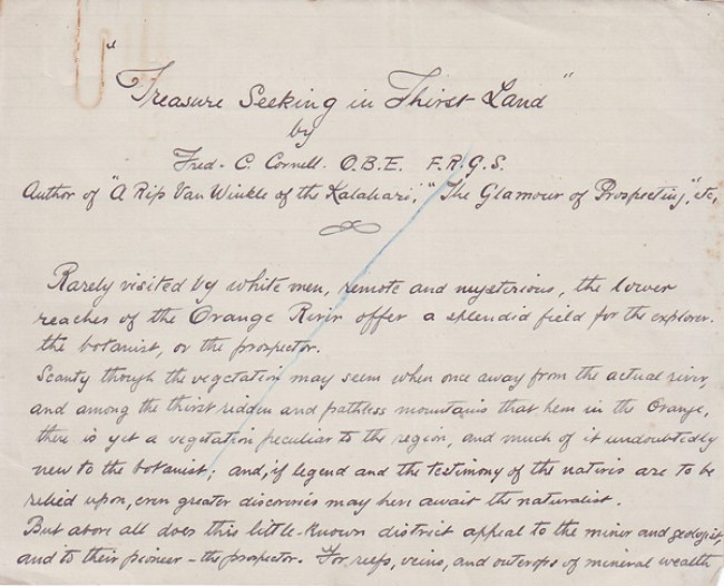 Manuscript title-page of an incomplete short story, penned & signed by the famous prospector and author, who wrote the ever-popular \'Glamour of Prospecting\' and \'Rip van Winkle of the Kalahari\'. Cornell was well-known among his family and friends for writing short fiction as well as factual contributions, on any spare scraps of paper he had to hand, for a host of periodicals - the rewards of which labours were often the only income that kept the wolf from the door.