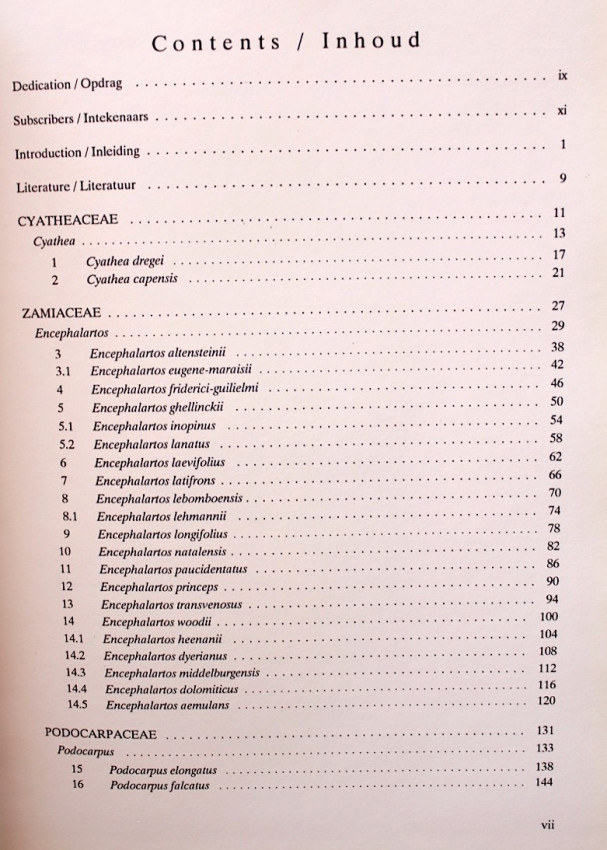 Pages 26 to 130 dedicated entirely to the unique Encephalartos family of cycads found in South Africa, with notes on their distribution, taxonomy, ecology etc. The location of each species is geographically pinpointed on a grid map.